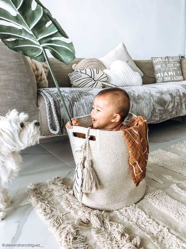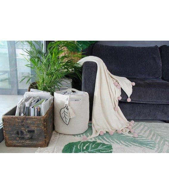 Braided cotton basket with circular base, in natural color and a natural color leaf hanger with tassel.