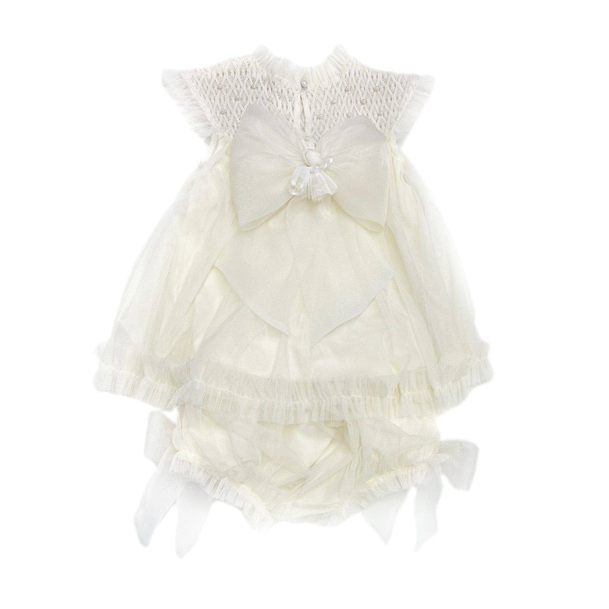 The Bella Blouse and Bloomers Set will have your little girl looking as beautiful as a princess. Made with buttermilk tulle, this set features an organza bow in the back and delicate pearl beading. Perfect for parties or any special occasion!