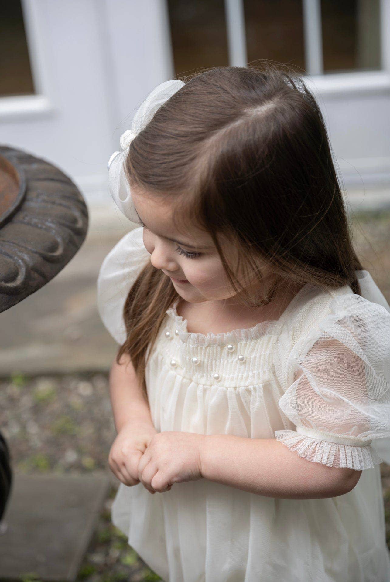 Darling buttermilk ivory color tulle romper with smock front adorned with faux pearl and large organza bow and bell detail in the back. Sheer tulle sleeves.
