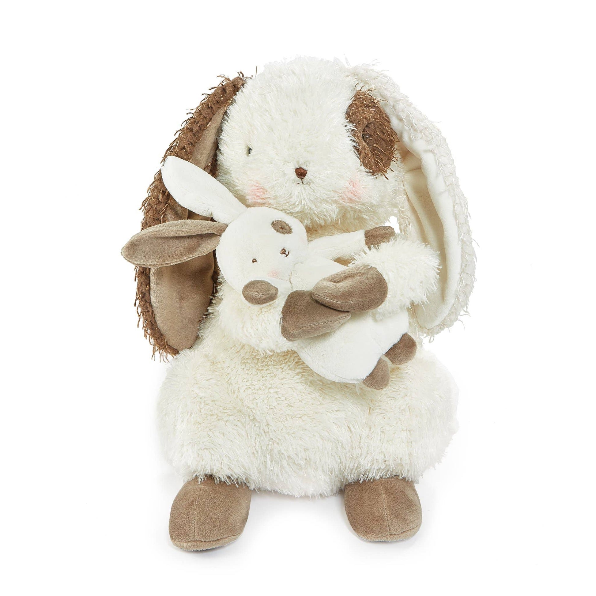 A sweet set of hares to celebrate either motherhood, being a big sister, a special auntie, or a new grandmother. Big Hare Little Hare Bunny stuffed animal oft cream fur with mocha, brown-furred features. Plastic eyes embroidered nose and long floppy ears.