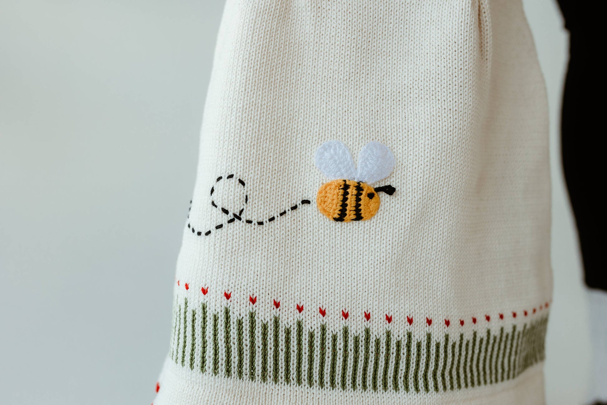 Delicate details of vibrant red flowers hand-stitched along the neckline and a cheerful embroidered bumblebee on the hem add playful personality. A pop of green grass and tiny red hearts border the hemline, creating a fun garden scene.