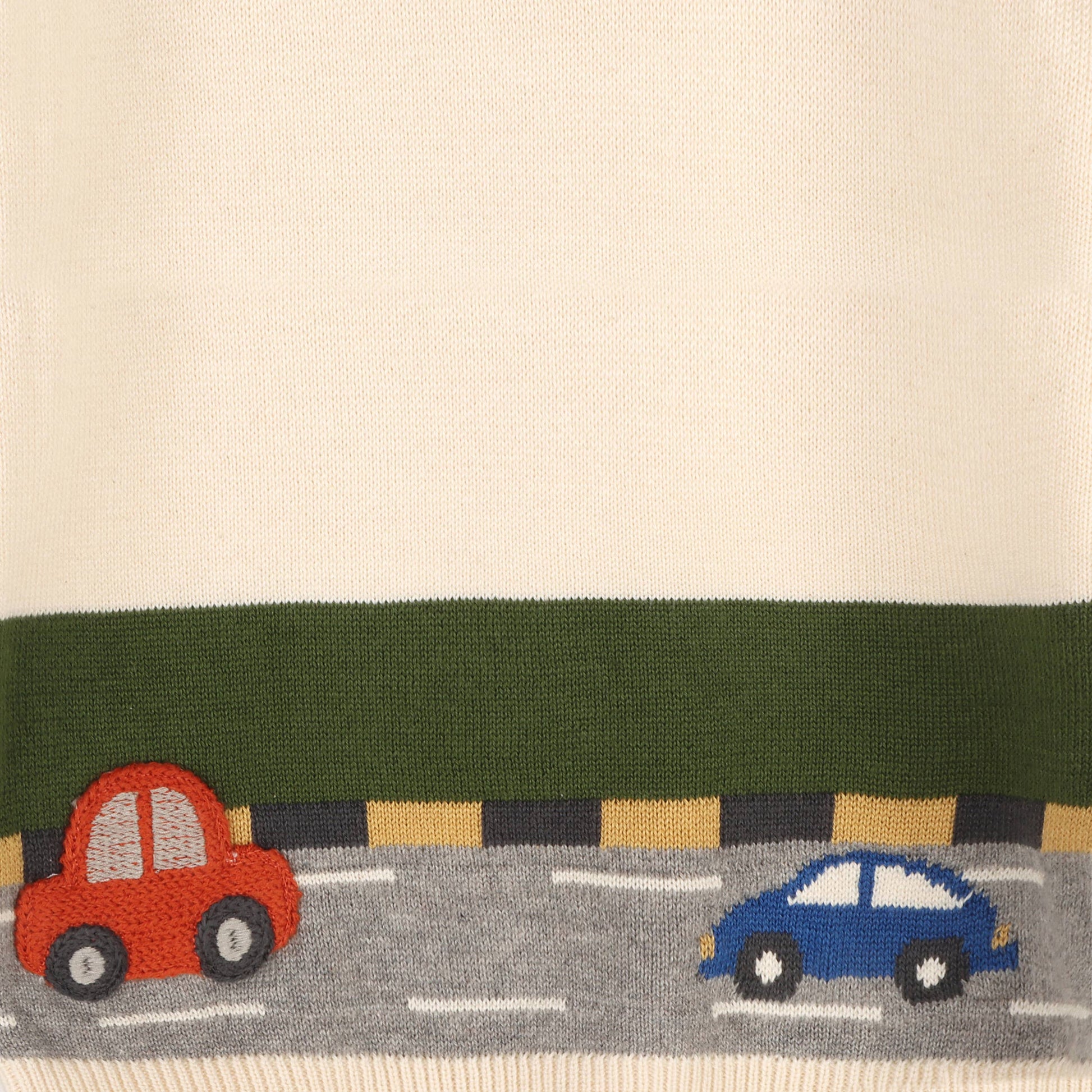 100% organic cotton sweater knit raglan sleeve baby pullover, featuring car applique and jacquard design.