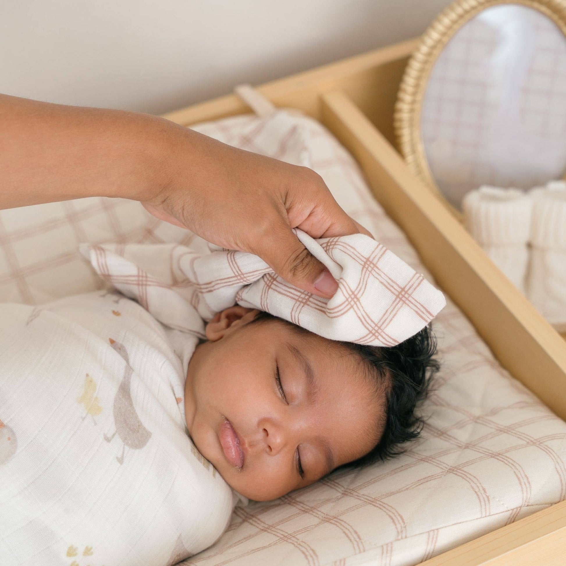 With its adorable goose design and soft cotton terry fabric, this hooded towel and washcloth set brings calm charm to bath time. The hood keeps baby warm after a soak, while the muslin cotton washcloths are perfect for gentle cleansing.