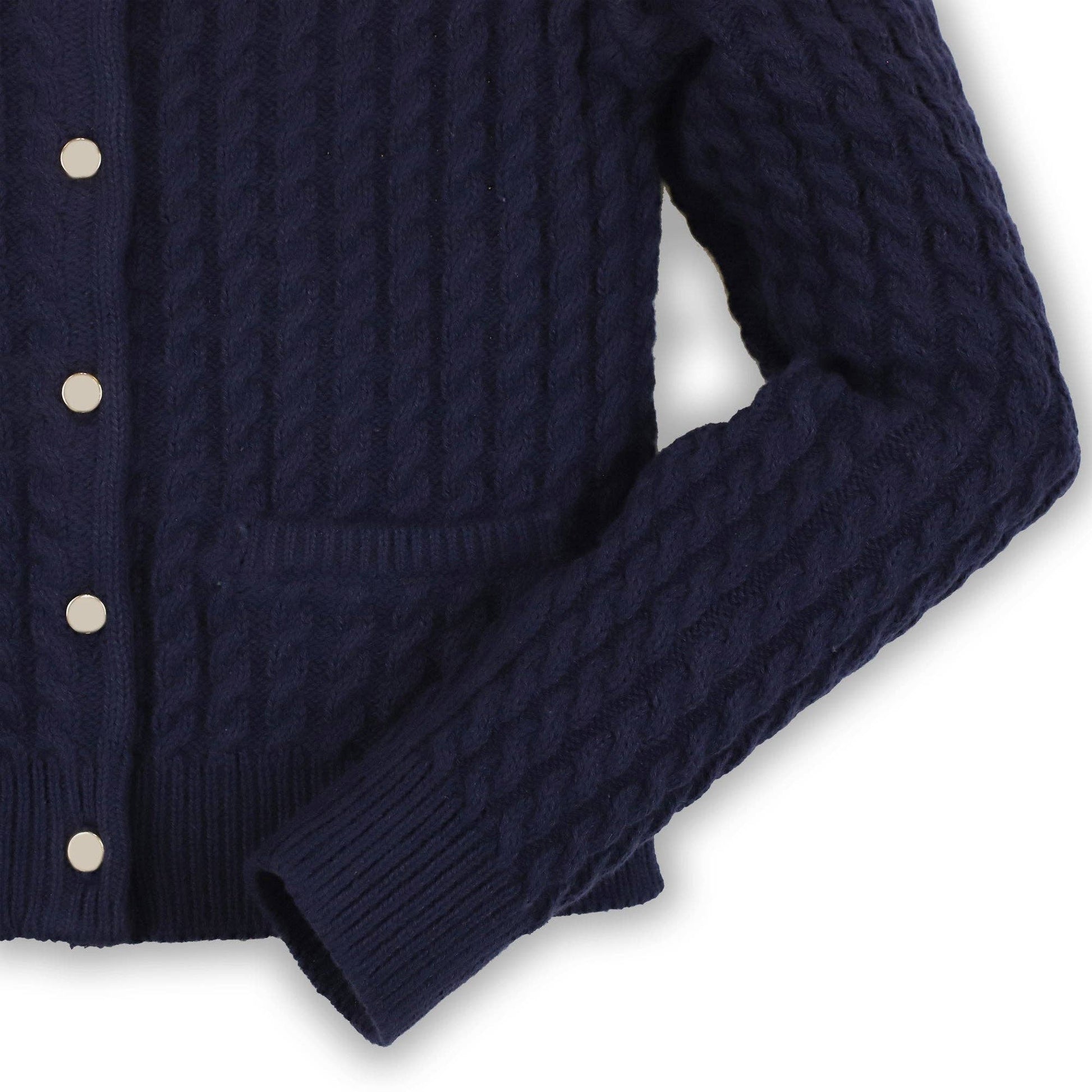 Our adorable classic cable cardigan in soft organic cotton is a sophisticated wardrobe staple for your little lady. This is the piece that layers perfectly with anything from a dressy dress, to a school uniform, to t-shirt and jeans! Features gold shank buttons at the center front and two sweet little pockets.