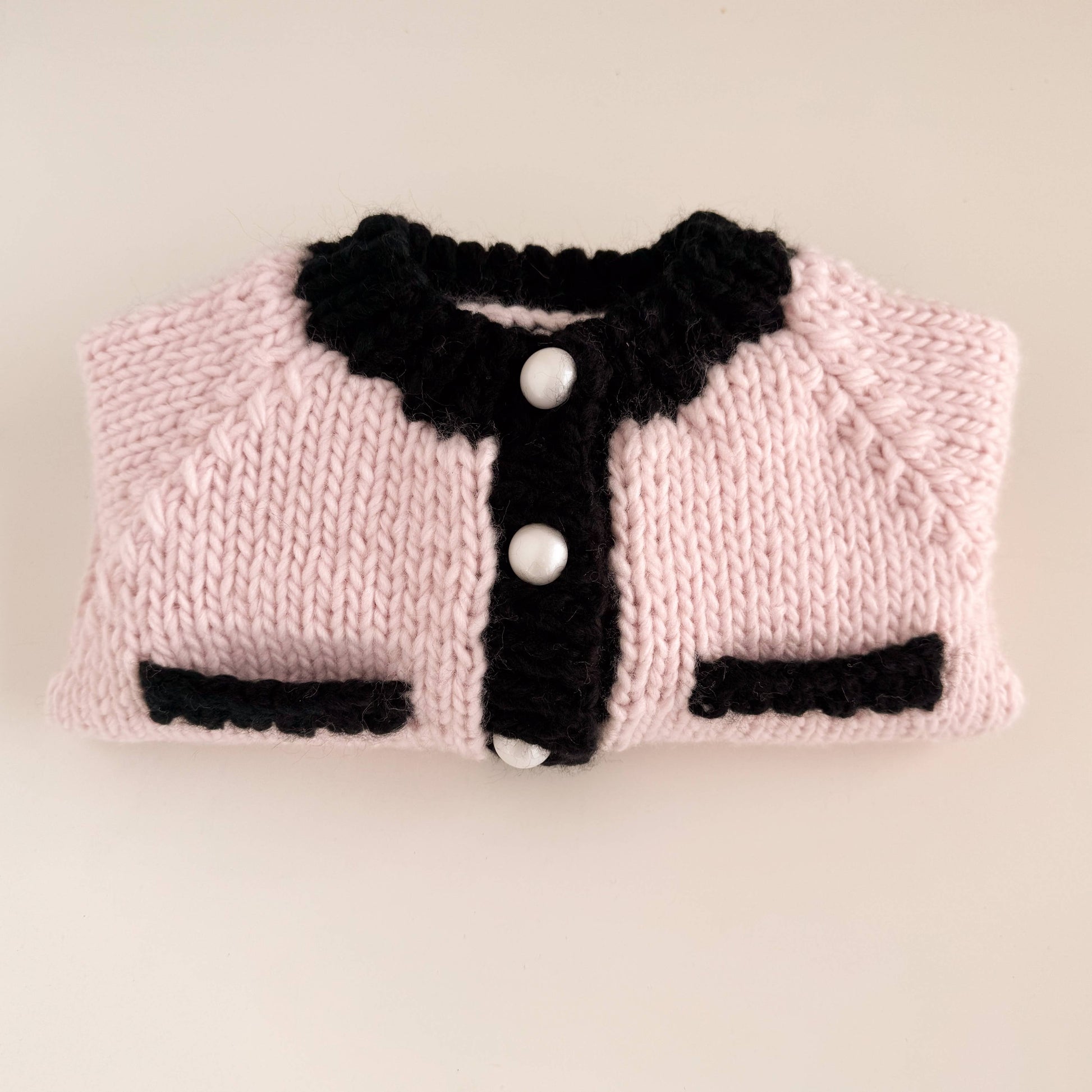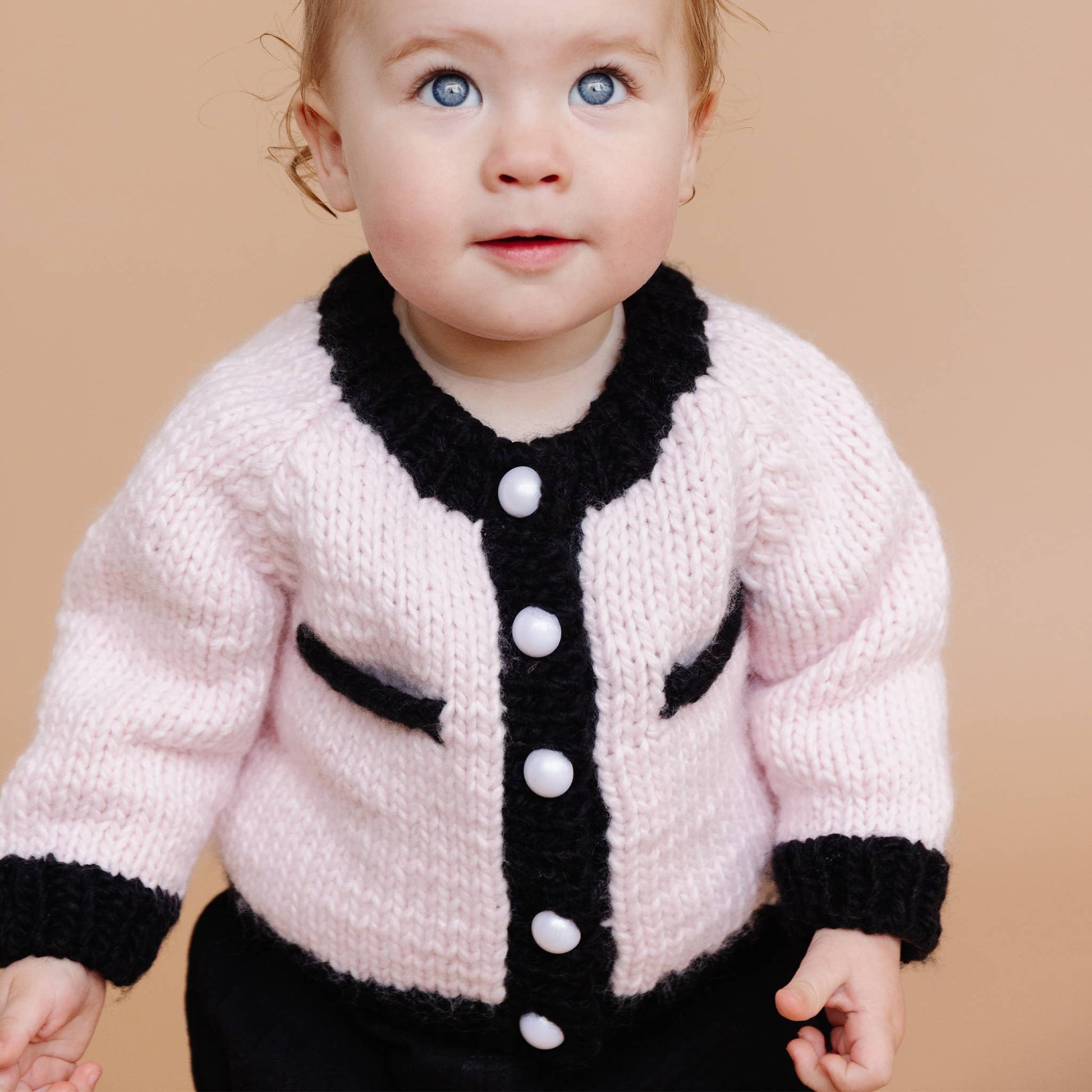 Features Black trim and faux pockets on a Baby Pink cardigan and beautiful faux pearl buttons. Get the matching Faur Fux Pom Hat or Bow Hat to complete the set.