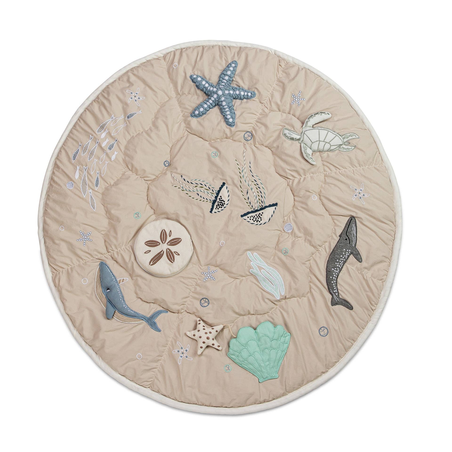Dive into a world of fun and learning with the Crane Baby Ocean Adventure Playmat. This beautifully designed round baby activity mat features an array of embroidered sea creatures, including a friendly whale, a playful starfish, a curious turtle, and more, all set against a soothing beige background. The intricate details, mirror with crinkle flap and soft textures are perfect for stimulating your baby's senses and encouraging tummy time, playtime, and early development.