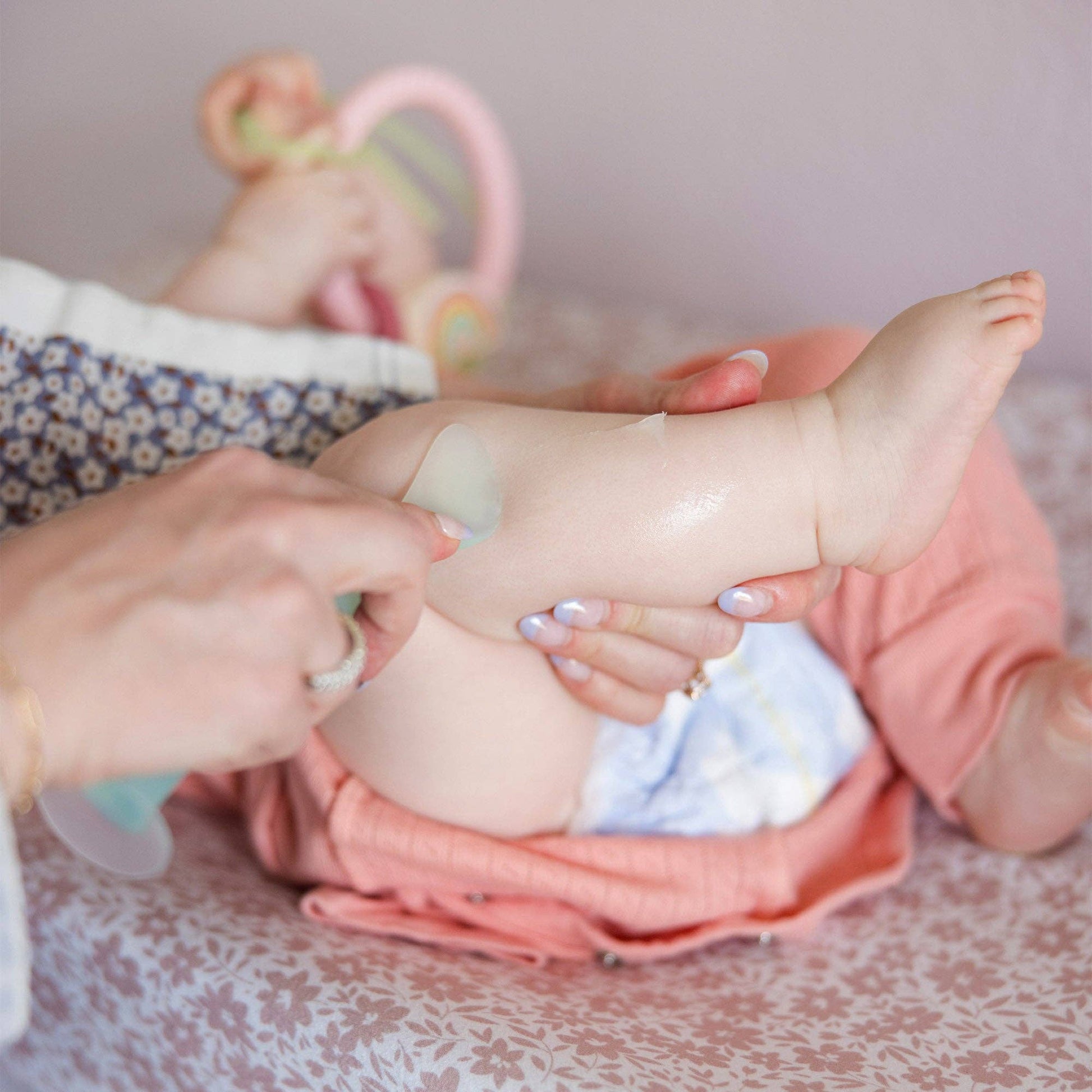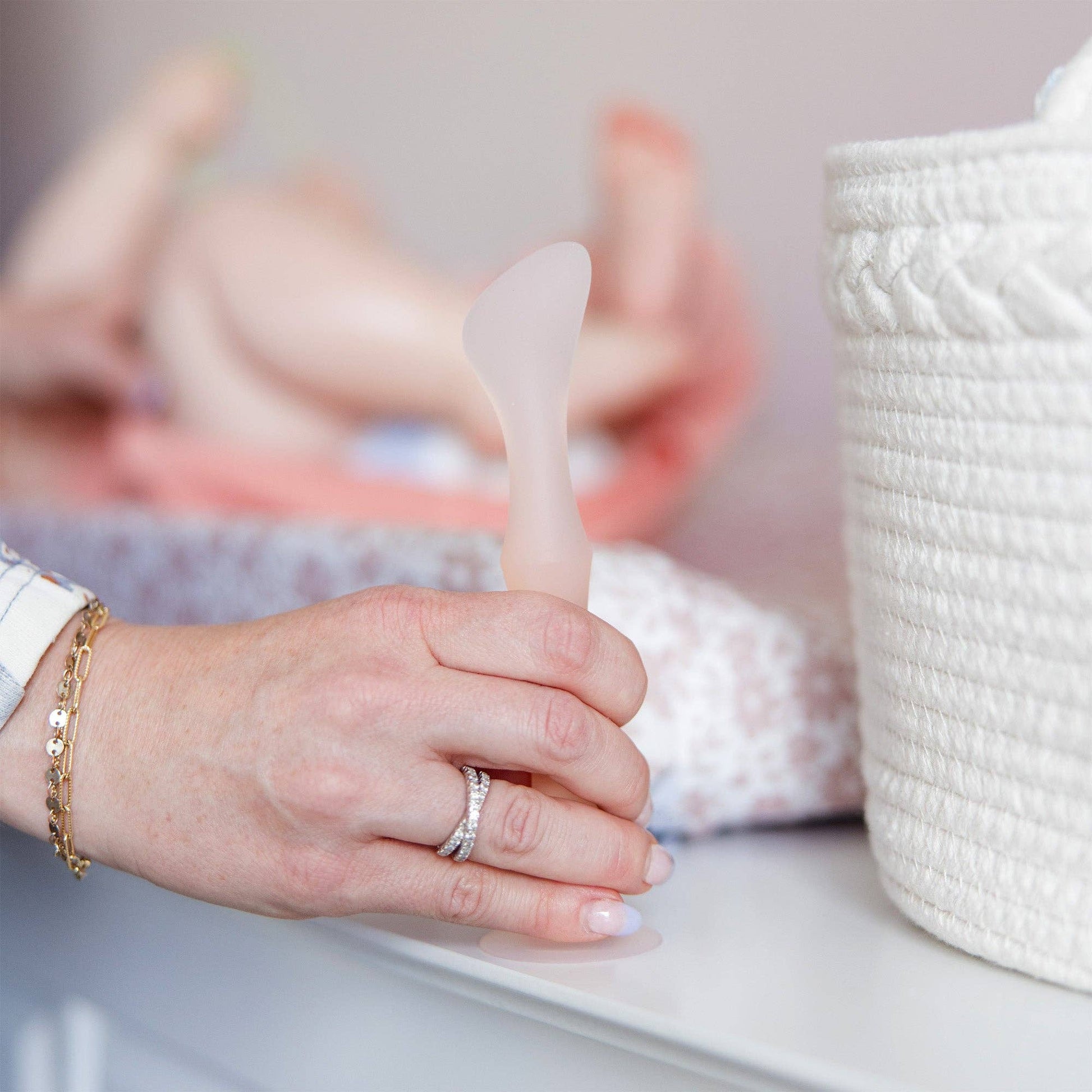 The Olababy diaper cream applicator streamlines baby skincare, ensuring precise and efficient application of various creams and ointments. Made from gentle, BPA-free silicone, it's soft and safe for sensitive skin. Simply apply cream generously, glide over the affected area, and wipe clean or sterilize as required. With its suction cup base, it stands securely on any surface, preventing mess and scratches.