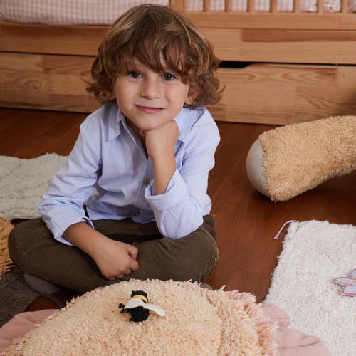 Our Pink Daisy floor cushion is a generous throw pillow shaped like a flower. With large pink petals in cotton canvas all around, the cushion features a tufted cotton center, in Golden chenille blended with rows of longer piles to create the textured surface of the middle of a flower.