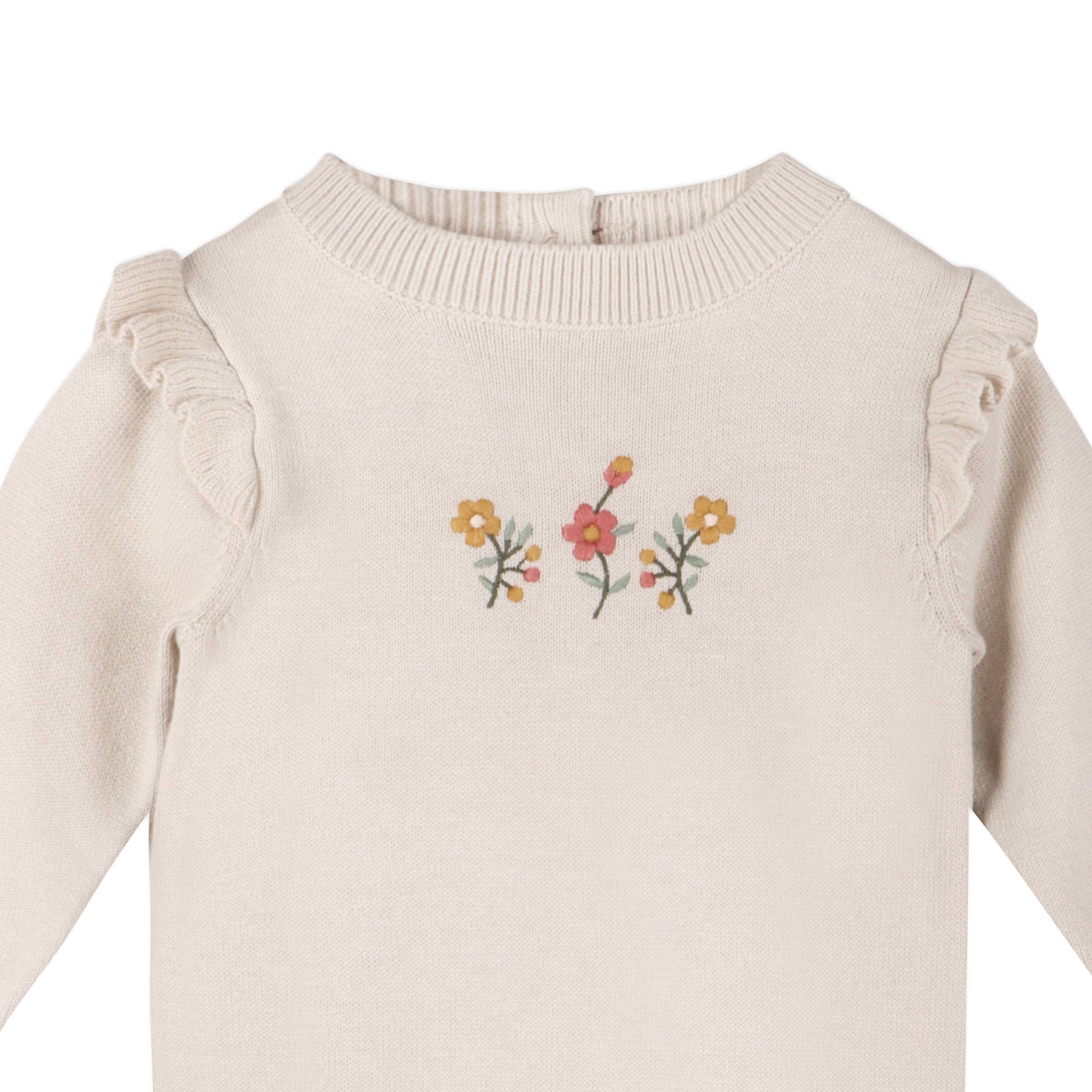 Floral Embroidered Ruffle Baby Sweater Jumpsuit (Organic): Stone / 12-18