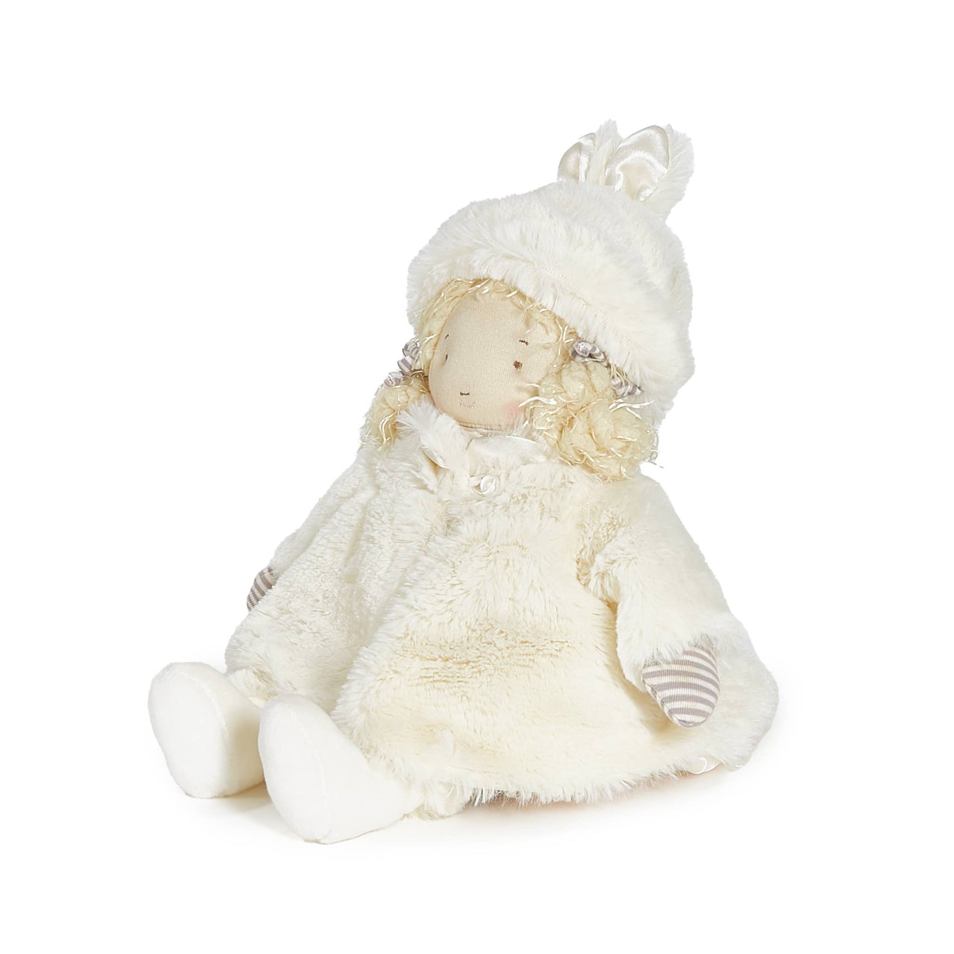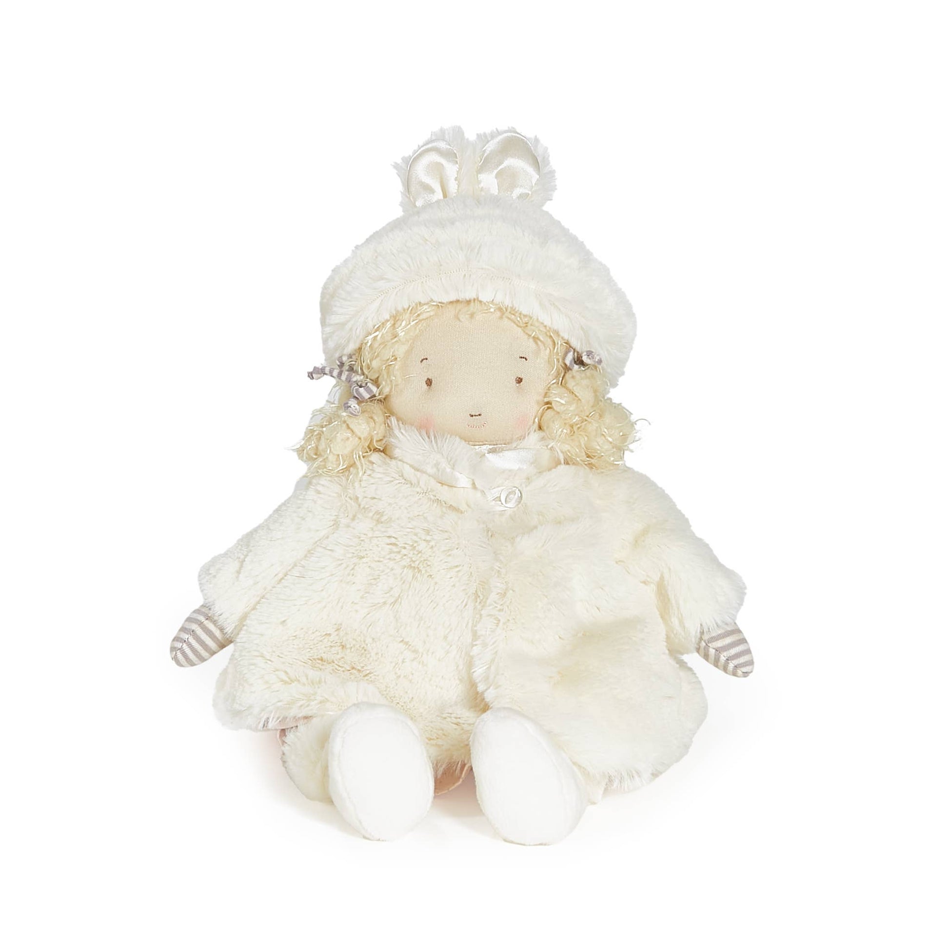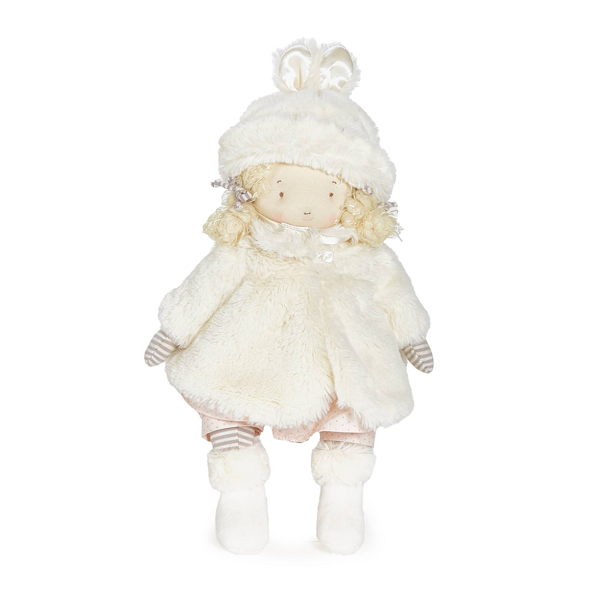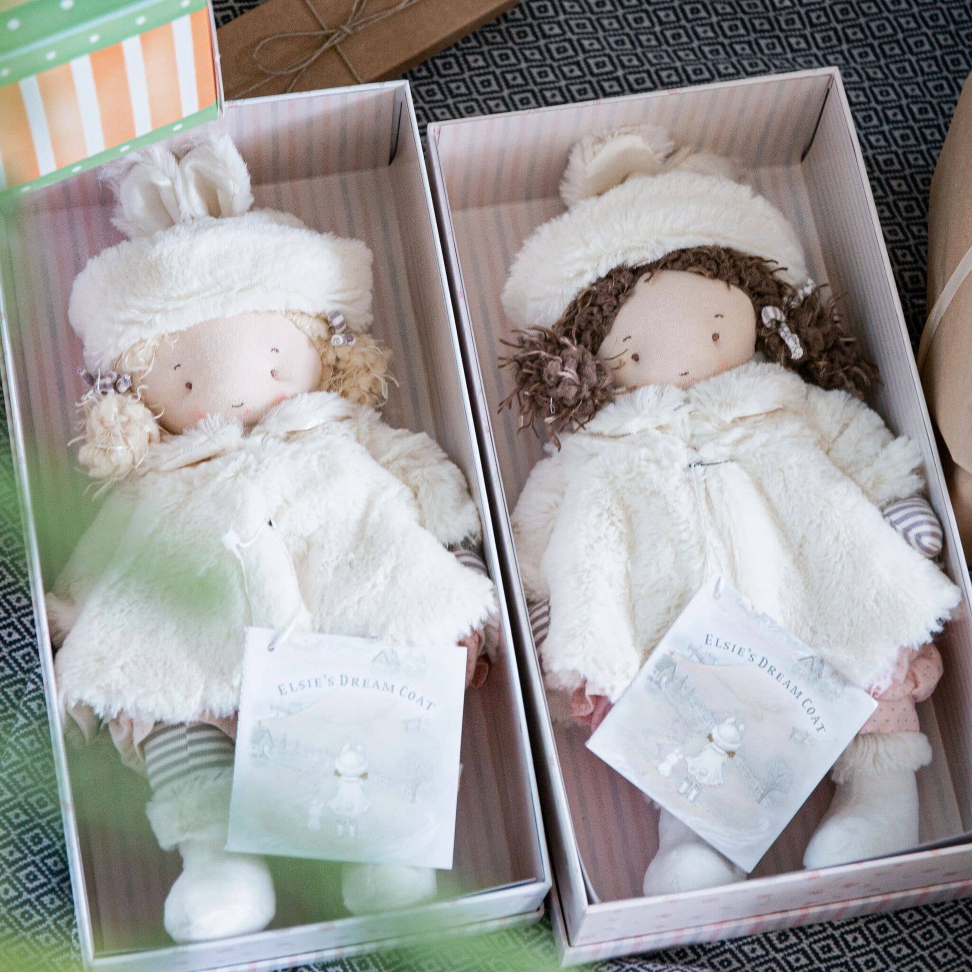 Bundled in her own Glad Dreams Coat and bunny ears hat, little Elsie is ready for many delightful adventures. This soft doll is perfectly outfitted in a pink and gray dotted frock, bloomers, and fur-trimmed booties to complete her outfit. Presented in a timeless keepsake wardrobe box with “Over the hill and by the bay to Grandma’s house I’ll go. Bundled in my Glad Dreams Coat. Oh, how the wind does blow!” written on the inside.