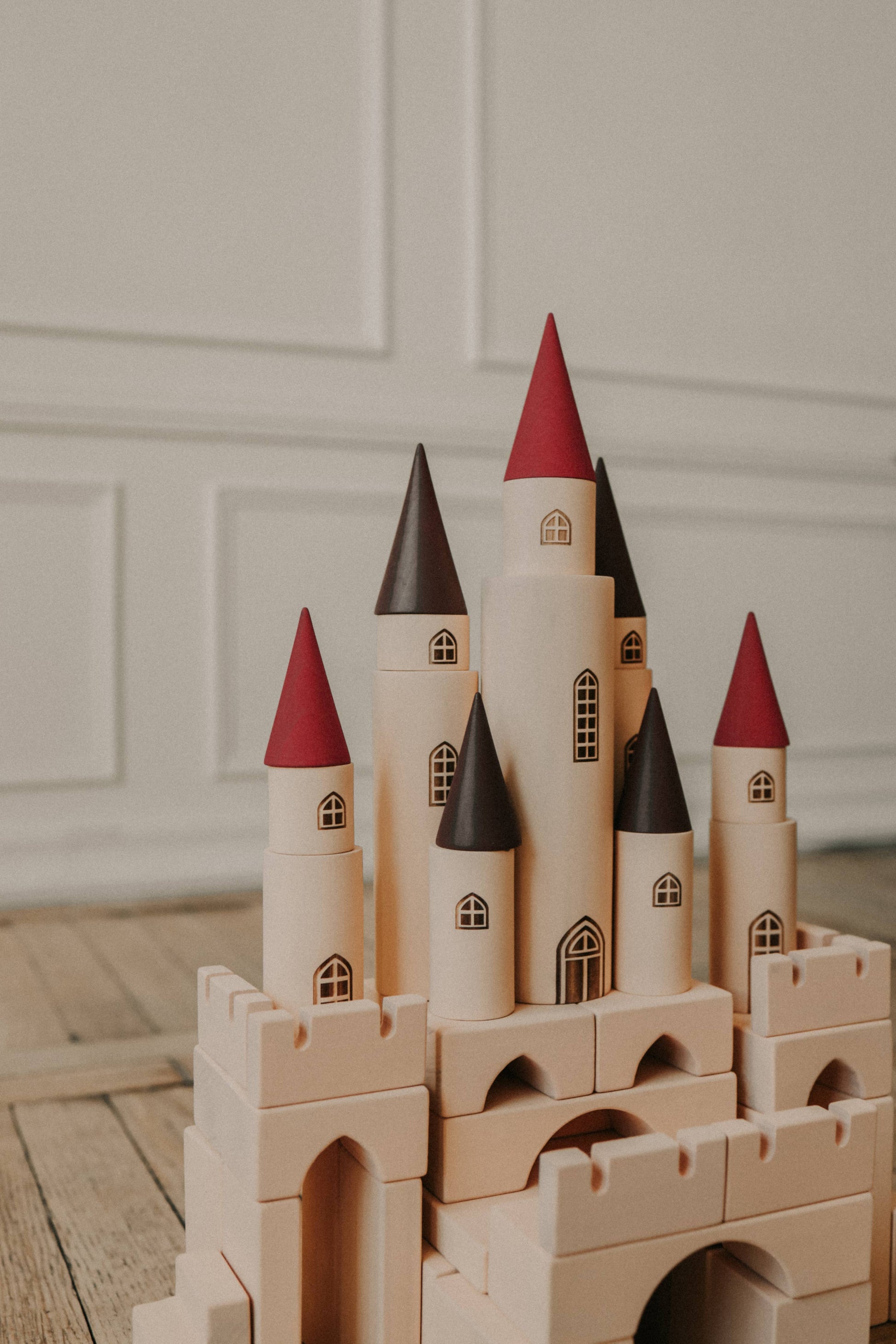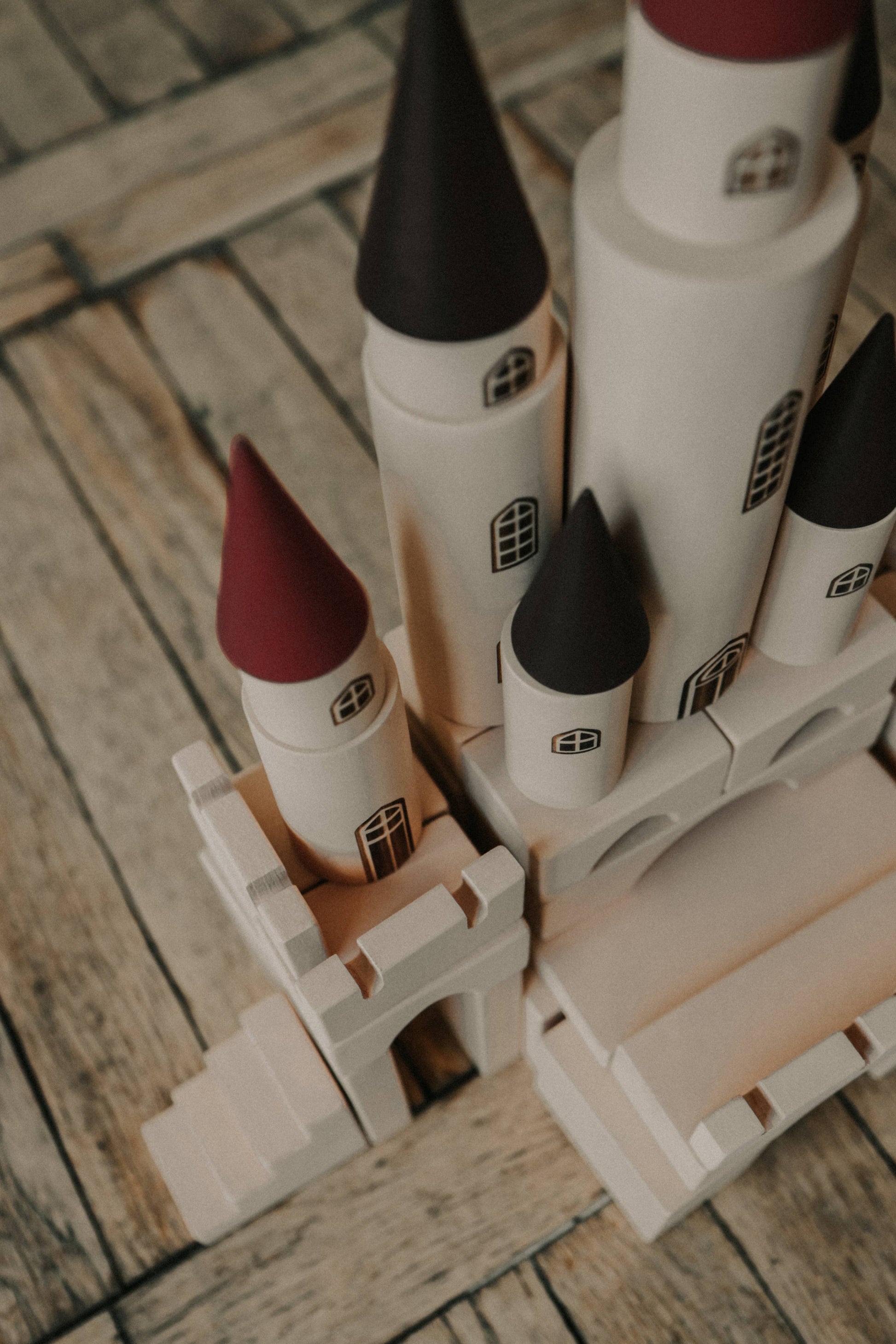 The constructor consists of 65 parts. In the set you will find 12 cylinders of different sizes, 7 cones of two sizes and different plates, blocks and arches. Each cylinder has an engraved window and/or door. Cones come in two sizes: three larger and 4 smaller. The set also includes 8 plates 2,36*5,9*0,6 inches (6*15*1.5 cm), 8 plates 1,57*3,54*0,6 inches (4*9*1.5 cm) in size; two long arches, a pair of stairs, 8 arches with a triangular cutout, 4 blocks 2,36*2,36*1,57 inches (6*6*4 cm), 6 blocks 2,36*1,57*1,18 inches (6*4*3 cm) and 8 double flat parts with two slots, measuring 2,36*1,18*0,39 inches (6*3*1 cm).