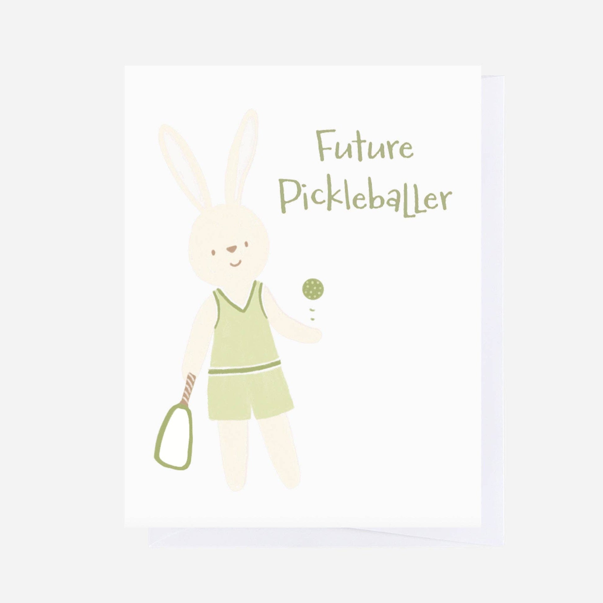 Welcome your future pickelballer with our Pickelball Bunny card, with the phrase "Future Pickelballer." Gift with our Ruby Pickelball Bunny plushie and Onesie.