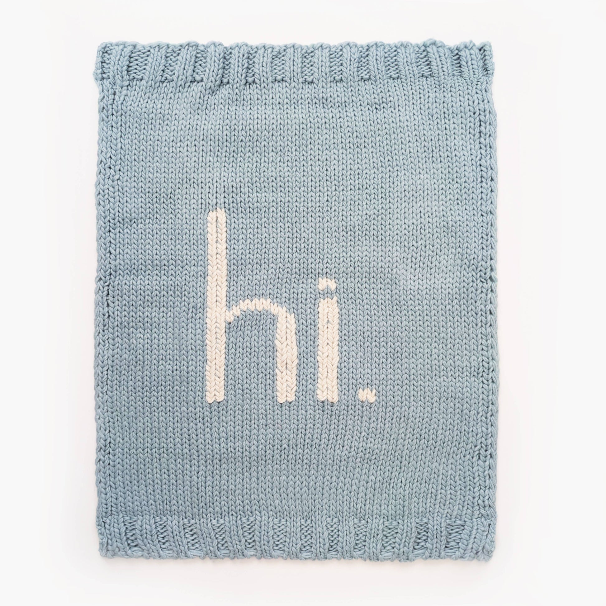 Welcome the little one with this adorable surf blue blanket! Hand knit from soft Icelandic Acrylic yarn, it features the word "hi." stitched twice in a natural yarn color. Perfect for those first hospital moments and photos, it also makes a charming baby shower gift. Complete the look with our matching hi. beanie. Blanket size is 18" x 24".