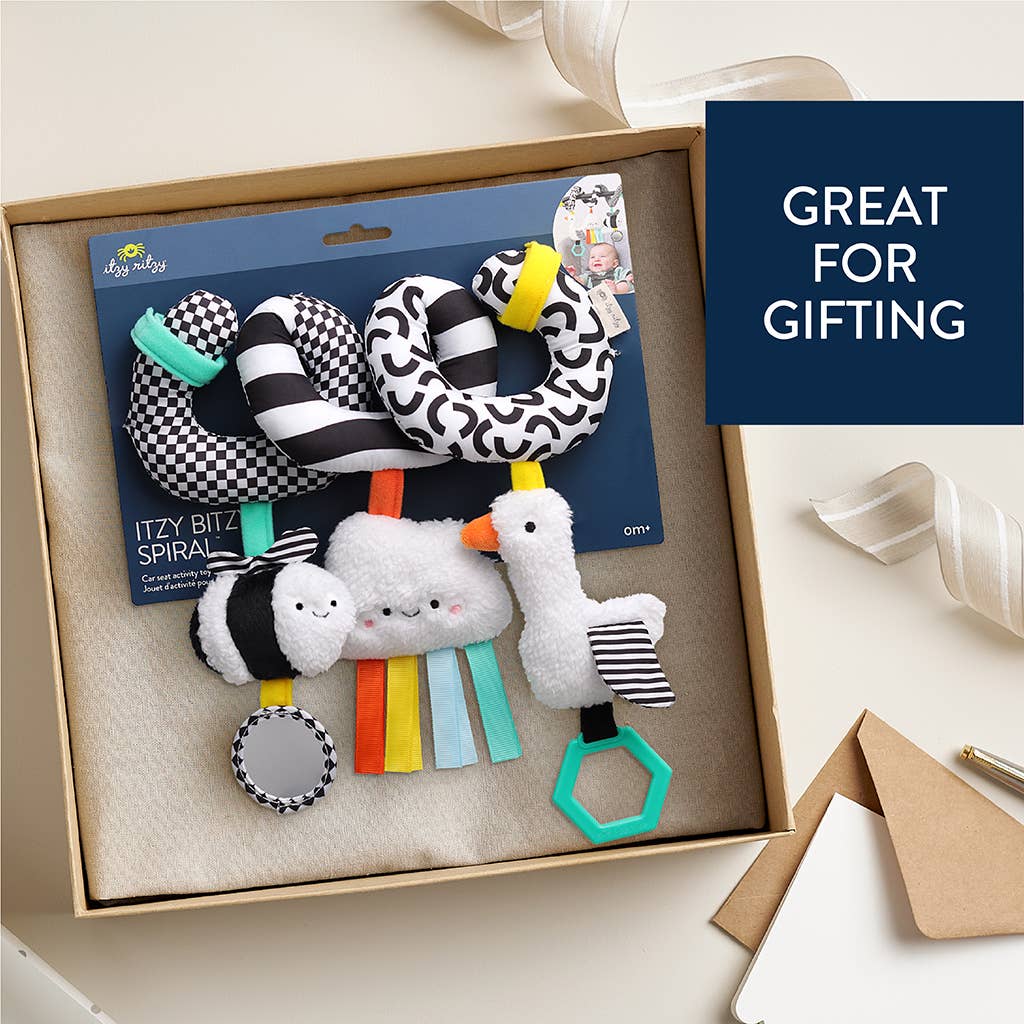 Watch as your babe reaches for the dangling rainbow rings, smiles at their reflection in the hanging mirror, and grasps for the ribbons keeping their little hands busy. Our natural cotton fabrics are gentle & soft to baby’s touch. For the many travels ahead, easily attach Itzy Bitzy Spiral™ to car seats and stroller for fun on-the-go!