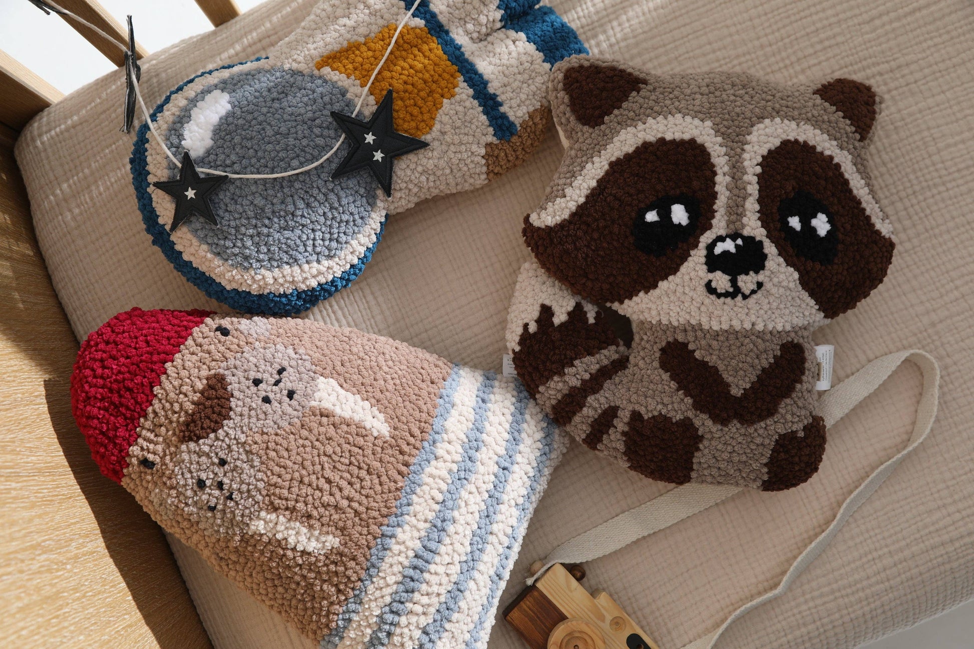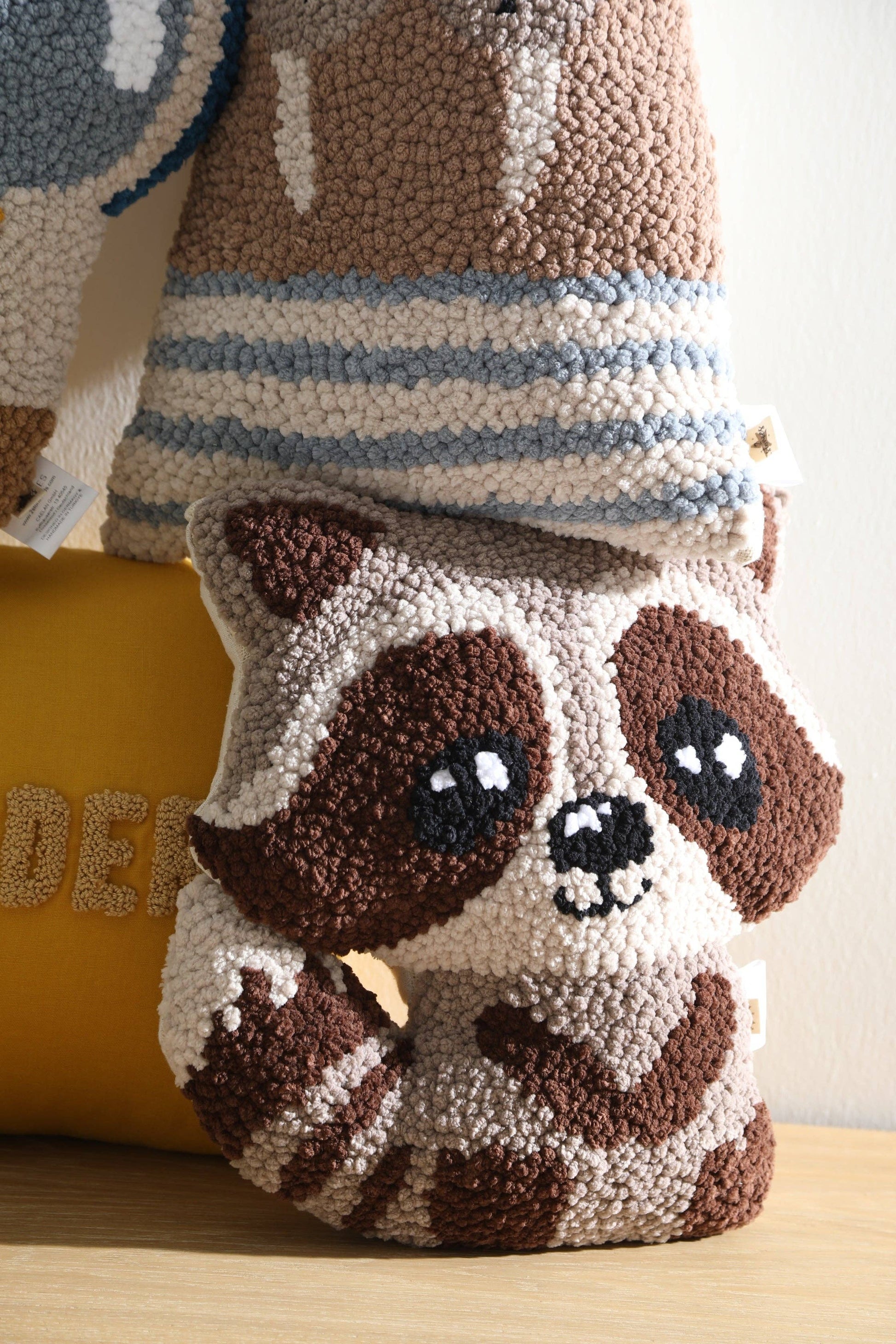 Unser Waschbär-Kissen ist in liebevoller Handarbeit mit der Punch-Nadel-Technik gefertigt. Die Vorderseite ist mit weichem Mikropolyestergarn bestickt, das eine kuschelige, schlingenartige Struktur ergibt - ideal für kleine Hände zum Anfassen und Erforschen.