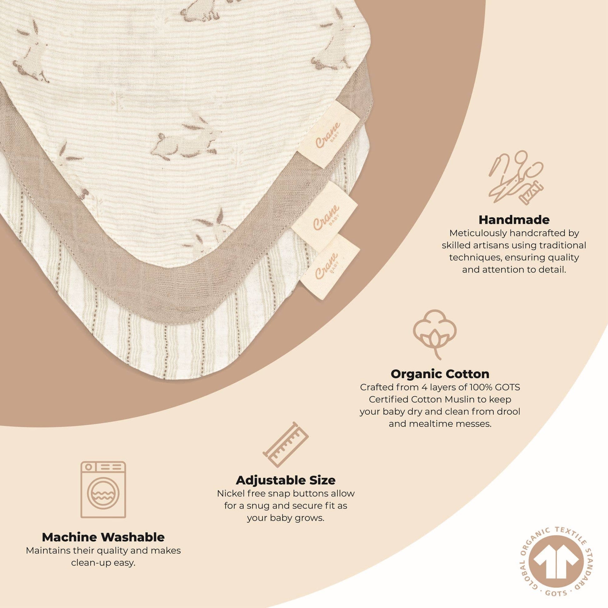 Embrace mealtime with our Avery Organic Bib Set. This set features three charming bibs, each hand-crafted from GOTS certified organic cotton. The adorable bunny print, neutral gray print, and vintage inspired striped pattern add a whimsical touch to feeding time. The bandana design, coupled with adjustable snaps, ensures a comfortable fit for your growing baby. Elevate your feeding routine with these eco-friendly and adorable bibs that perfectly complement the Avery nursery collection.