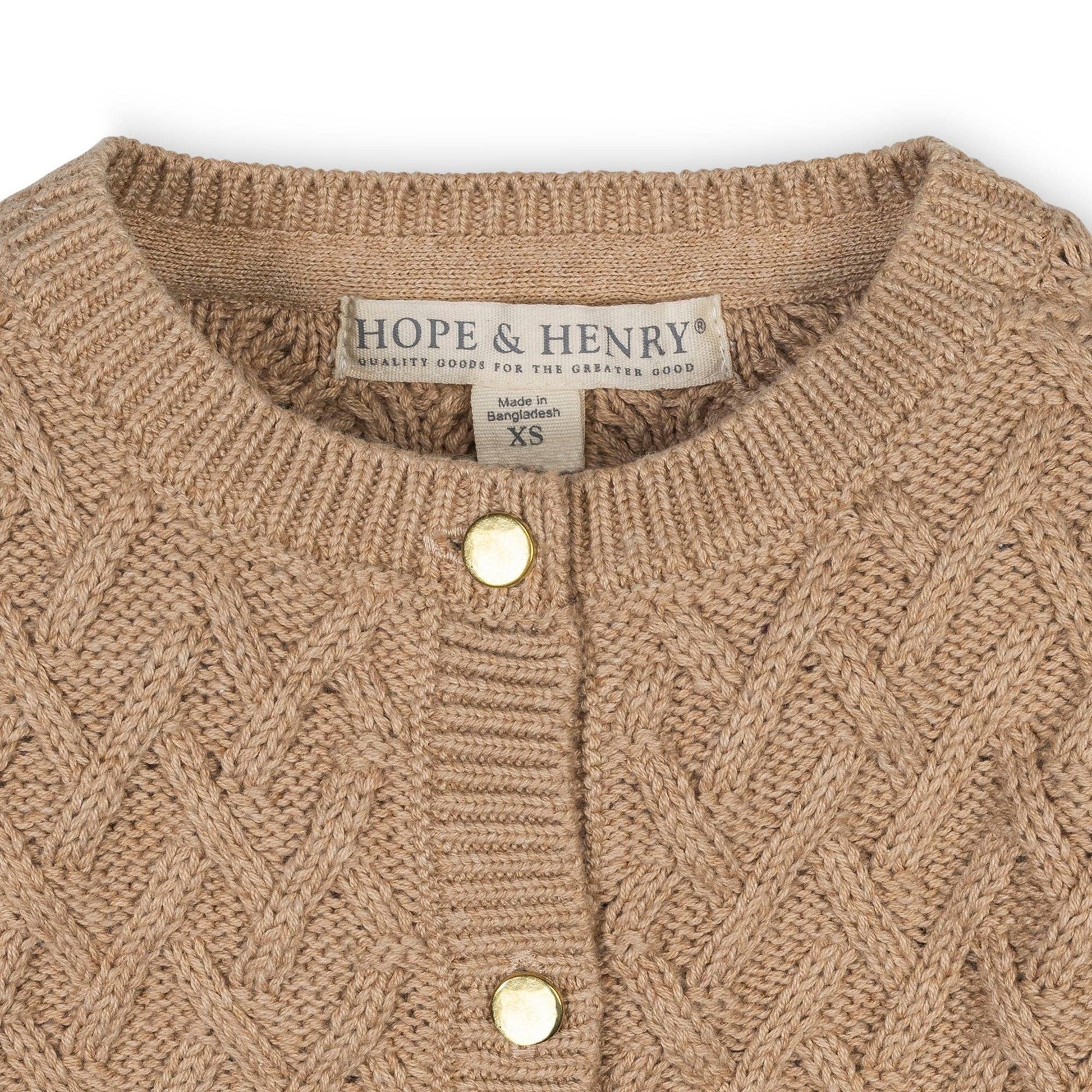 Our beautiful classic cardigan in soft organic cotton is a sophisticated wardrobe staple for your girl. Knit in a lofty herringbone cable, this piece layers perfectly with anything from a dressy dress, to a school outfit, to t-shirt and jeans. Features gold shank buttons at the center front and two sweet little welt pockets.