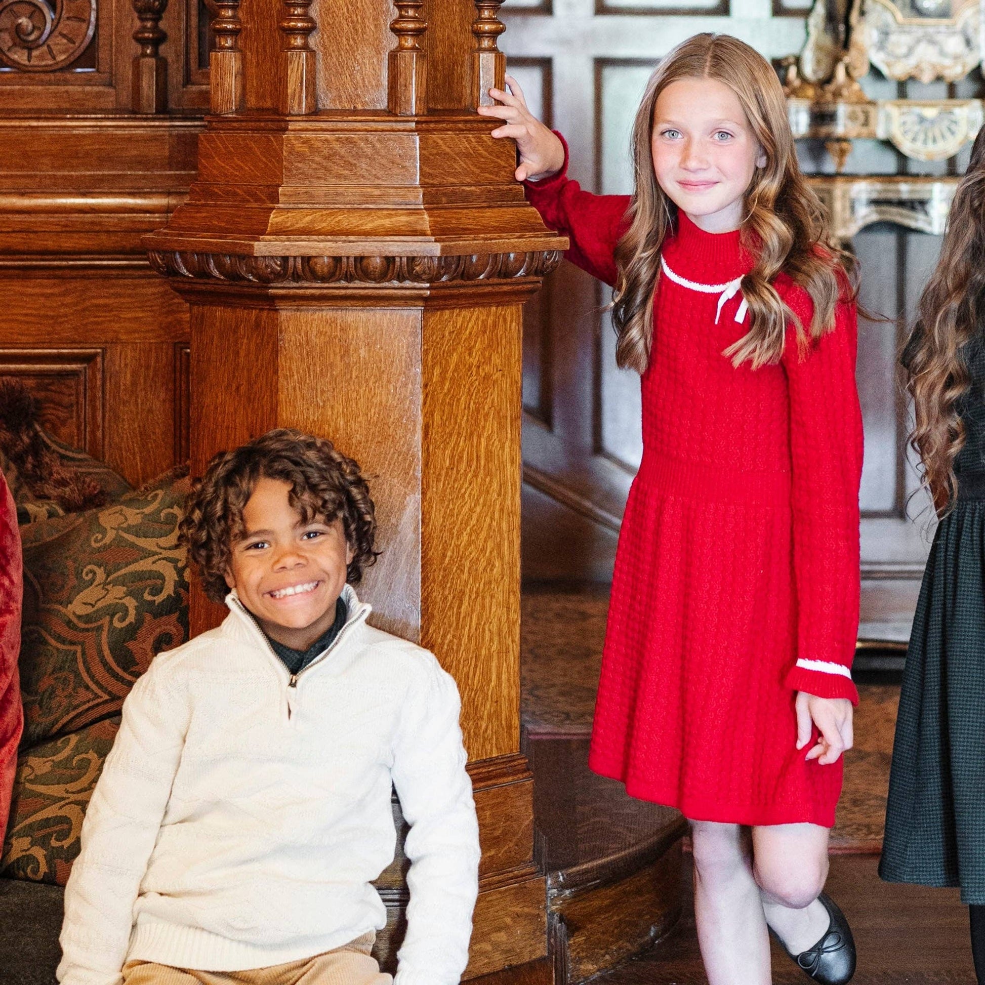 This sophisticated piece combines the polish of a dress with the comfort of her favorite sweater (aka the best of both worlds). Features a cozy mock neck, ruffle cuff, applied bow detail, and beautiful allover cable knit design. A special piece in soft organic cotton with a gold button closure at the center back.