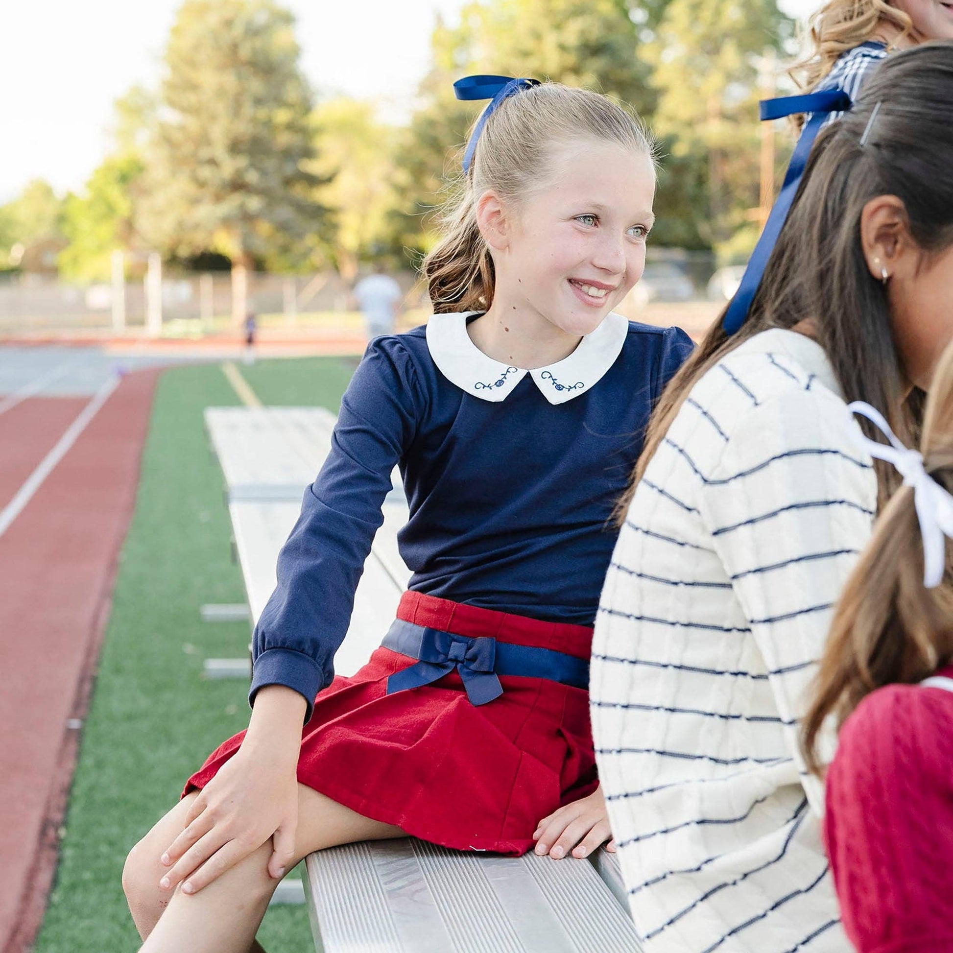 Organic Peter Pan Collar Knit Top: Navy with Embroidery / XX-Small