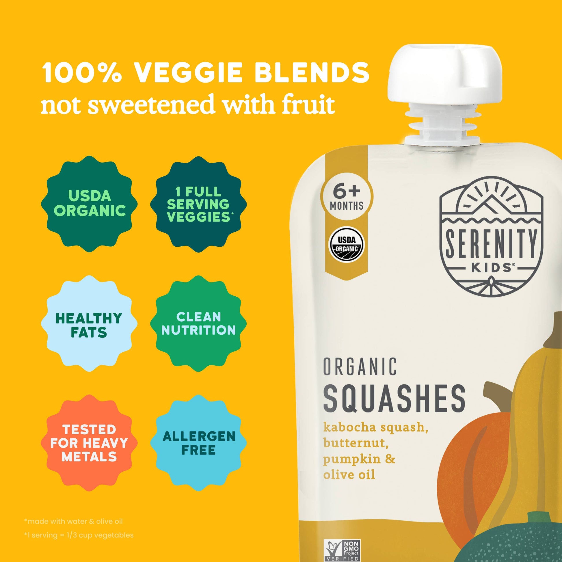 Our Organic Squashes baby food is packed with nutrition and flavor because every bite counts! This savory blend of our favorite squashes has zero added sugars or sugary fruits which allows your little one to develop a love for the rich taste of squashes at an early age. We add organic olive oil for essential fatty acids that aid in nutrient absorption and brain development. Plus, we only use the highest quality of ingredients that are USDA certified organic!