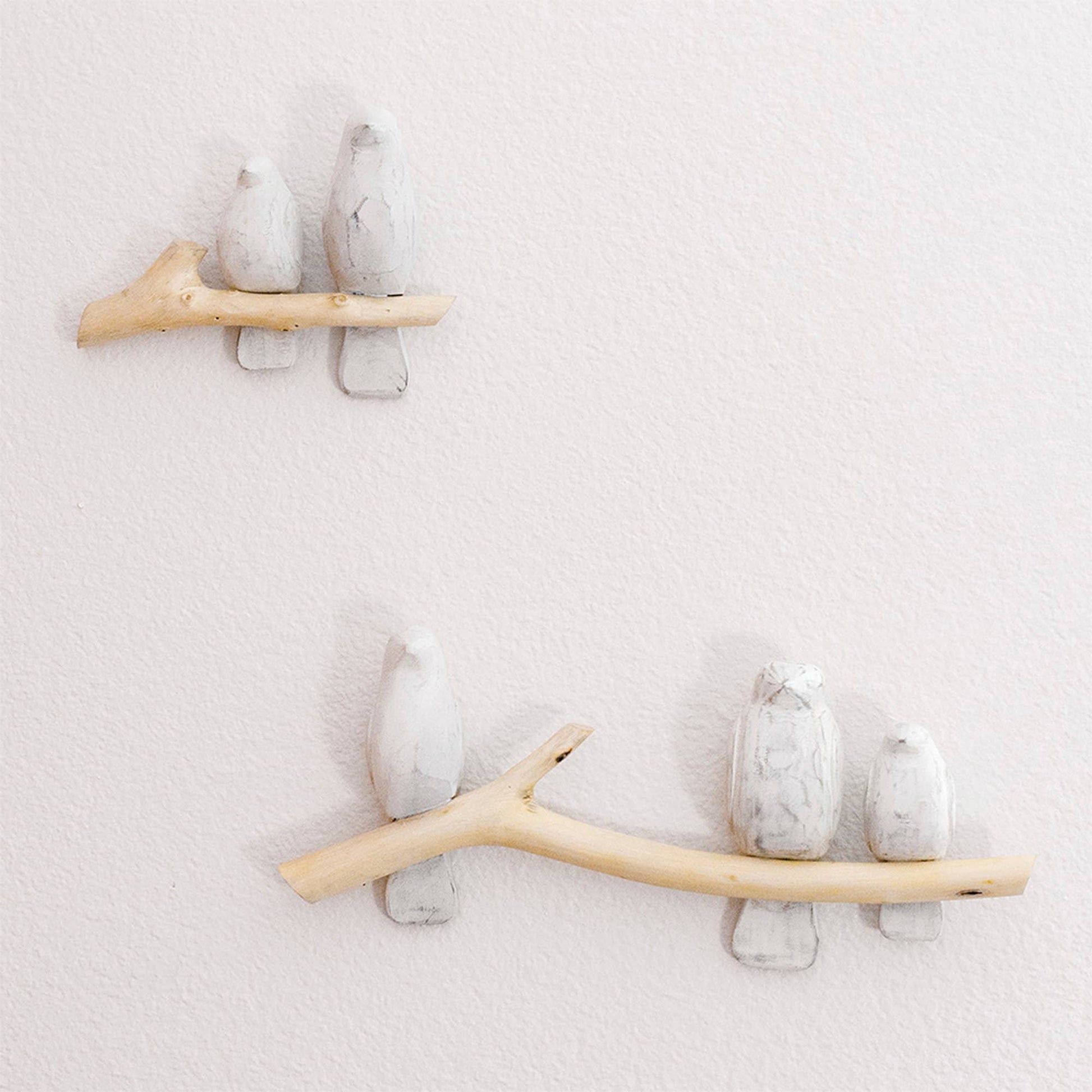 Bring nature indoors with this lovely wall décor design. Hand crafted by artisans making each piece beautifully unique. Set includes 2 branches with hand carved birds. The perfect accent to your nursery, play space or kids room. Style with our Crane Baby bedding for a curated look.