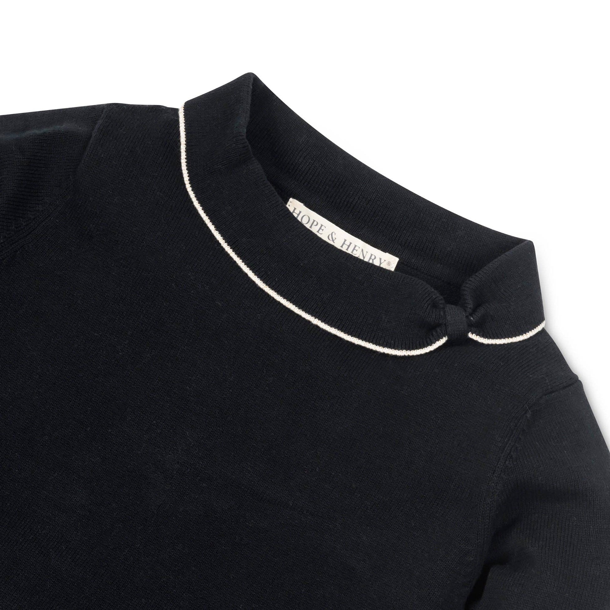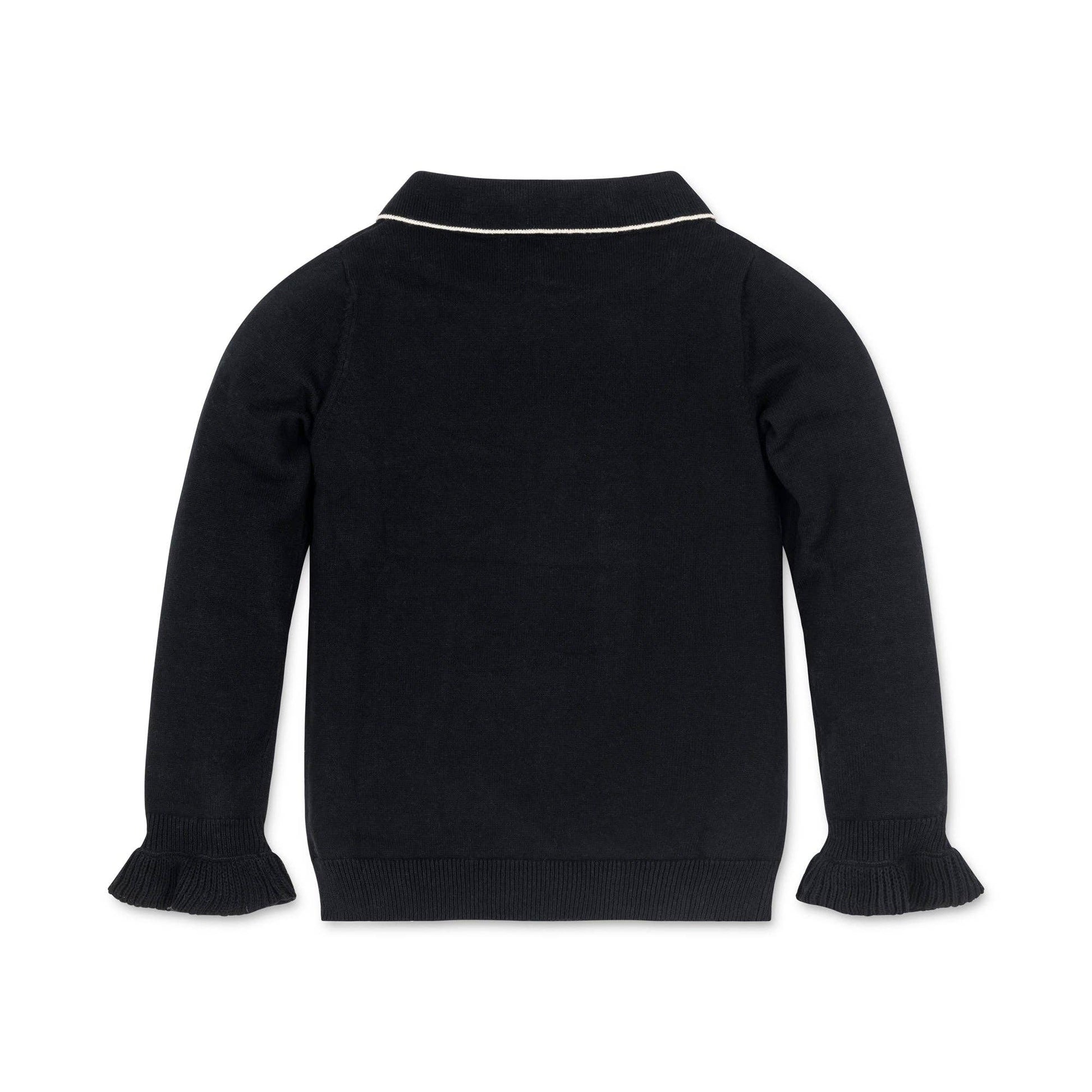 An everyday sweater with feminine flair that will have your girl looking polished in a snap! Our adorable pullover sweater in soft organic cotton is adorned with a sweet asymmetrical rounded collar with contrast tipping. Features ruffled cuffs for a fun and girly look. Pairs perfectly with our collection of organic cotton skirts and leggings.