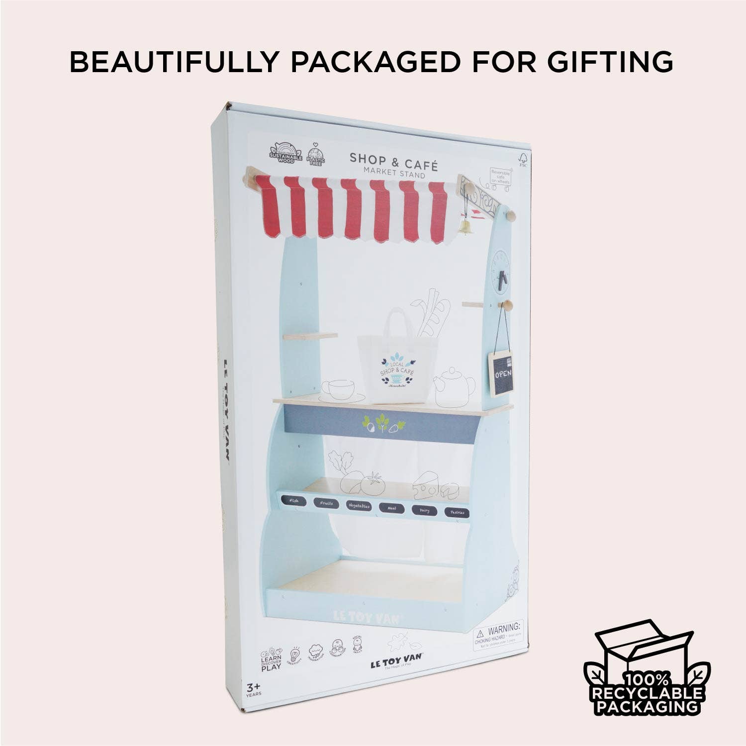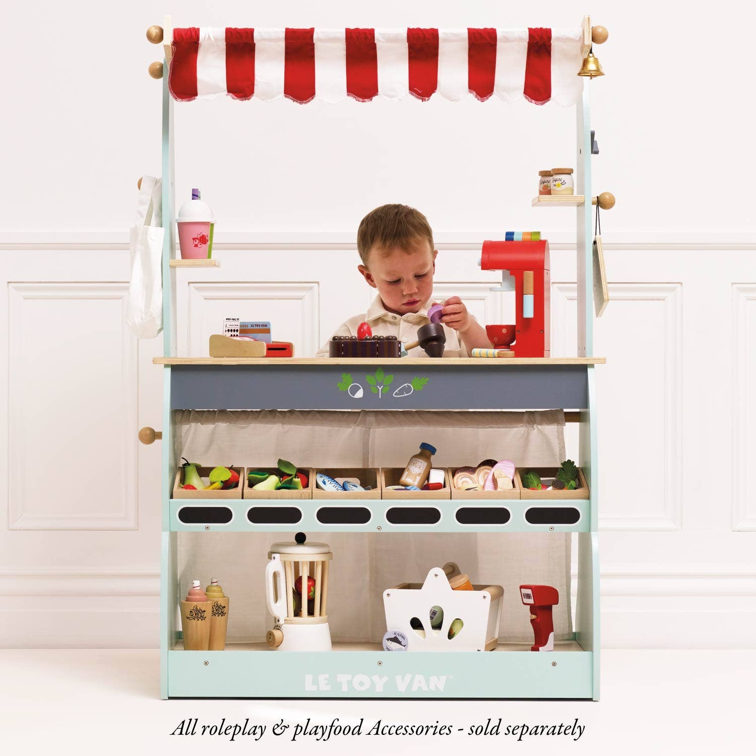 Our amazing wooden Shop and Café stall is a firm favorite. With lots of interactive features, little ones will adore serving customers at the café! Then simply turn it around to reveal a market-style shop, complete with shelves for housing our wooden food crates, a reversible chalkboard, fabric shopping bag and a bell for customers to ring for attention. Designed with wheels and stabilisers for easy transport. A wonderful role play toy to inspires creative imaginative play and assist with learning and development.