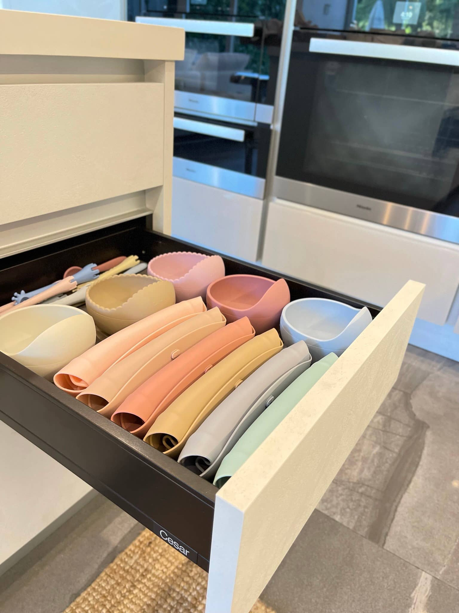 Our brand new roll-up & stay closed bib has the same features as our original bib, but now we added a little button so it can be closed. This is great since it makes it easy to store at home and on the go in your diaper bag. The bucket of the bib now serves as storage for utensils. Easy to spot from counterfeit products since our bib is branded in 4 different areas.