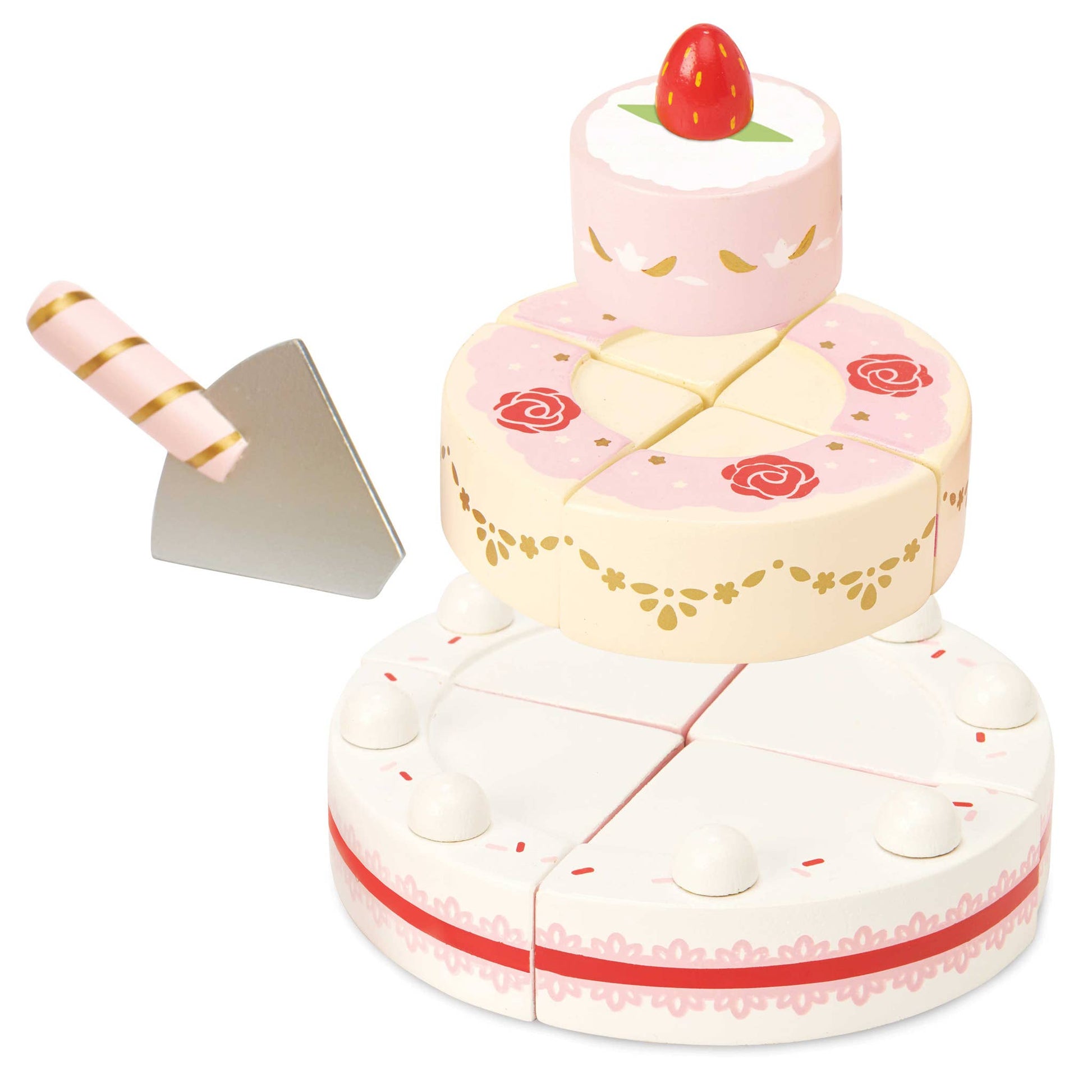 Let's celebrate! Tuck into this delicious classic 3 tier wedding cake, adorned with lashings of cream with a strawberry motif inside and out. This stunning 10-piece wooden toy is ideal for extended role play, imaginative fun. The lower and mid tier sections come in 4 detachable sections (with velcro fastenings), for added realistic play plus a cake slice for serving guests. Swathes of golden paint and a strawberry on the top adds the perfect finishing touch to this decadent treat.