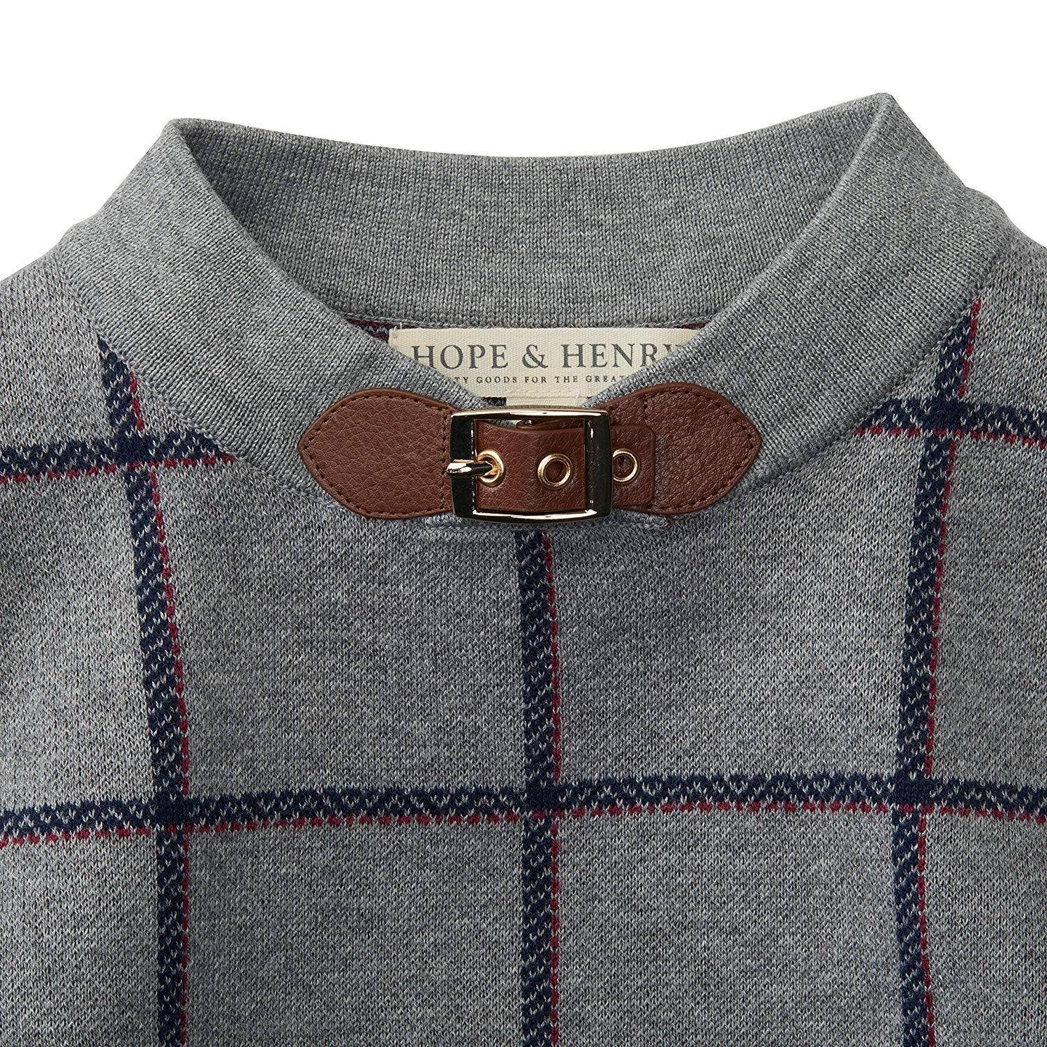 Features a beautiful gray plaid intarsia in our super soft organic cottons, a faux leather and gold buckle closure at the neckline, and faux leather button details at the armholes.