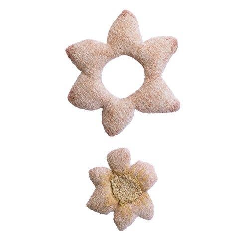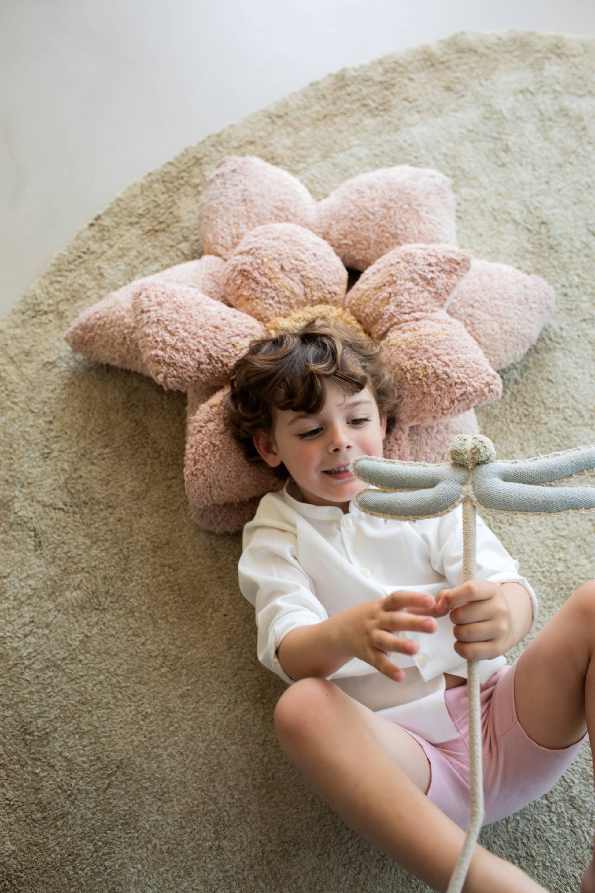 Shaped as a Water Lily, this puffy rug is made in shades of Olive and Honey colors mixed in different proportions, inspired by the ever changing color nuances of nature. The rug has rounded edges simulating the floating Water Lily leaf, and the decorative pink flower cushion is made of two separate cushions, easily removable from the rug through a cord system, and a discreet opening in the rug. The cushions can be used separately.