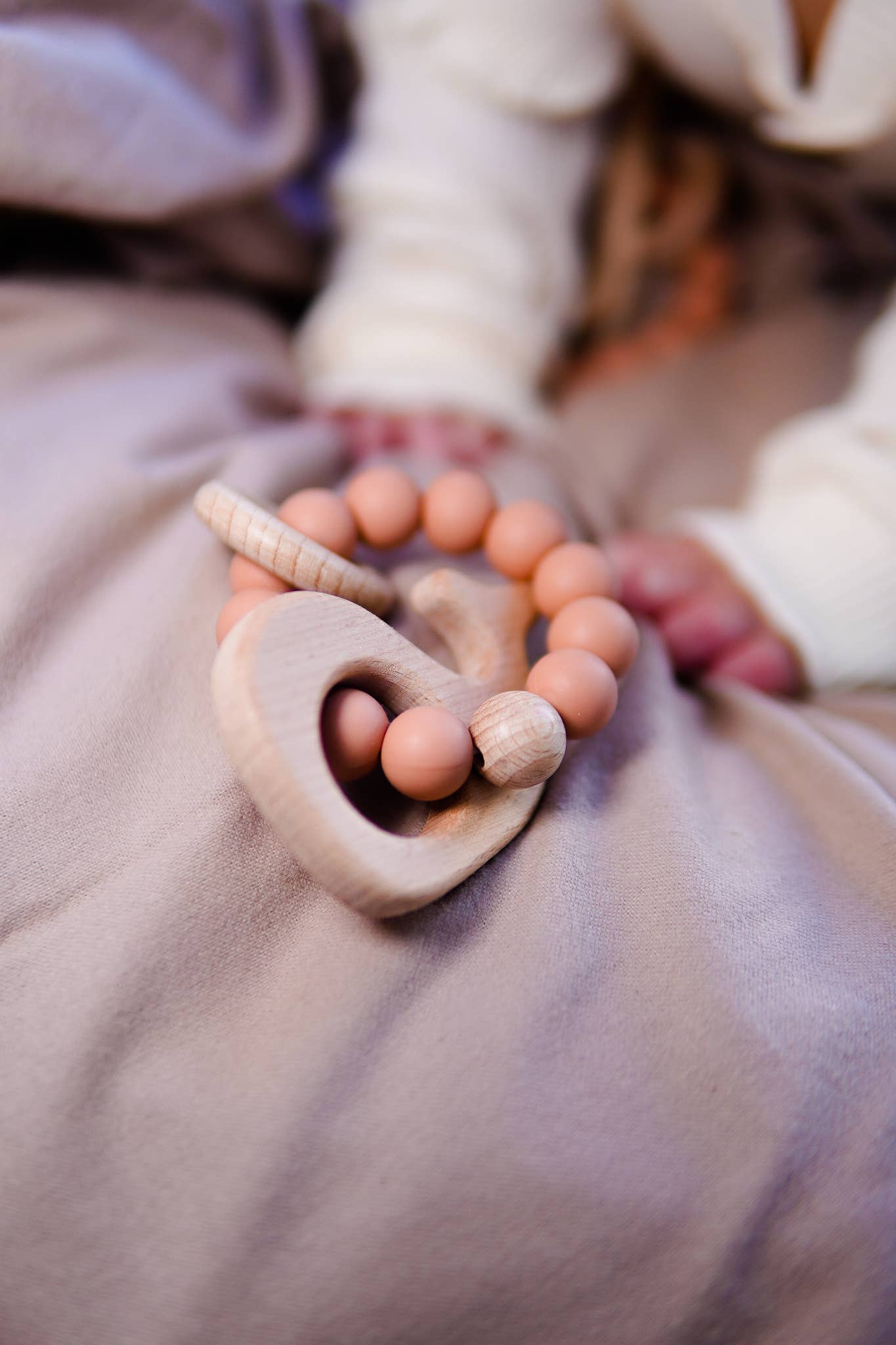 Ease your little one's teething pain with a combination of soft food grade silicone beads, and beech wood accents.