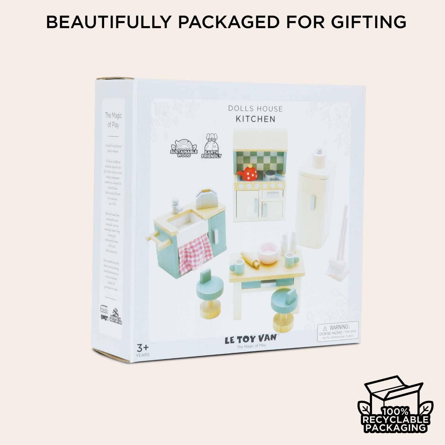 Cook up some fun with this stunning kitchen furniture set. A lovely addition to any child’s small-world play setup, it features a lovely contemporary look that will add instant style to any miniature dream home. This high-quality toy set comprises 20 individual solid wood accessories, a sturdy kitchen table with 2 matching stools, a freestanding fridge, an oven with a sideboard, a sink and drainer, plus a whole host of cooking utensils and kitchen essentials for serving up tasty treats. This sweet set is compatible with our full range of stunning dolls houses, lovingly crafted and built to last for generations of play. Compatible with all of our dolls, dolls houses and accessories.