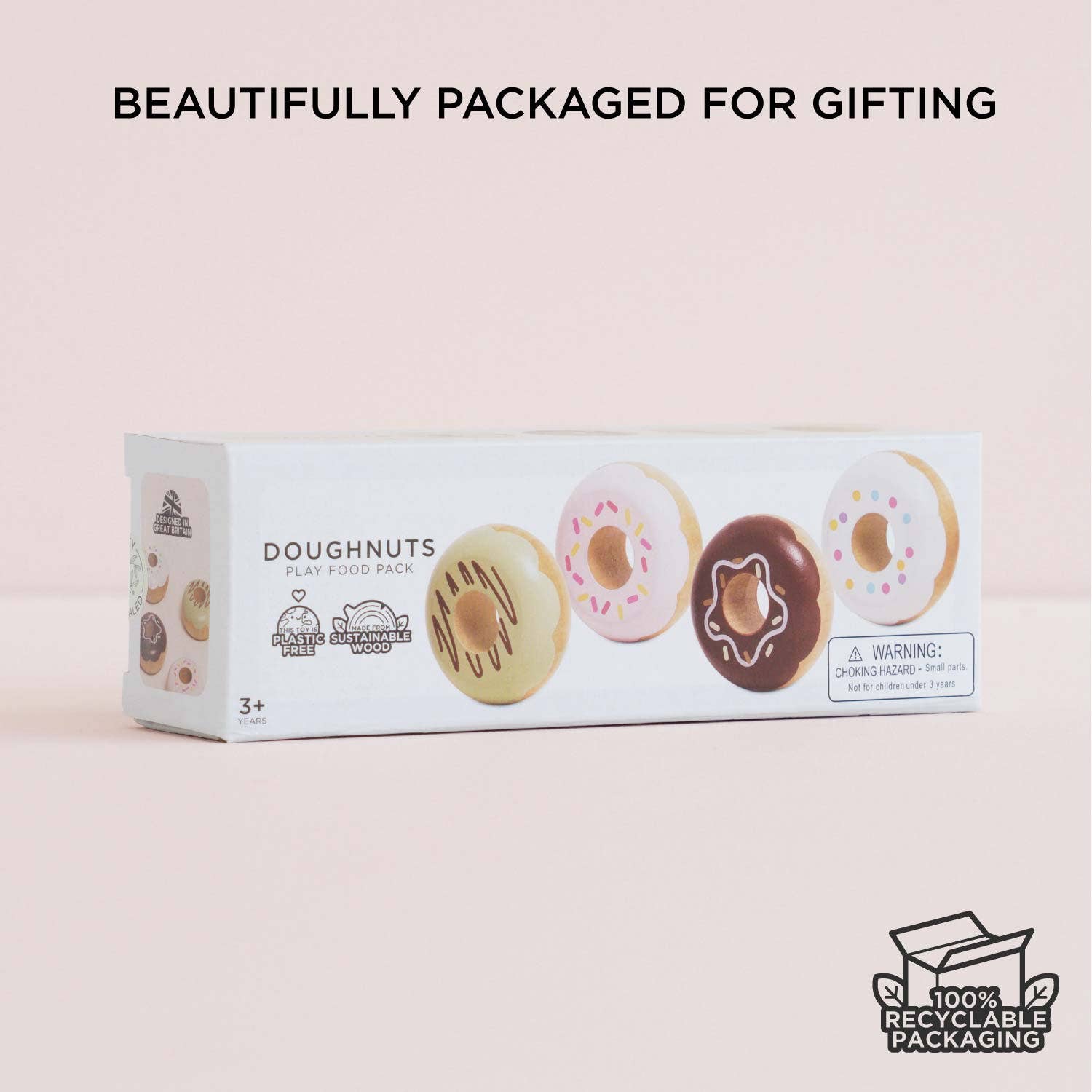 Tempt tiny imaginations with this wonderful set of four delicious wooden doughnuts.